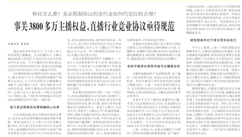 《中国网络视听发展研究报告(2025)》显示,截至2024年12月,我国网络直播用户规模为8.33亿,与之对应的职业主播规模达3880万,同比增长1.5倍。事关3800多万劳动者的权益,网络主播竞业协议的现状如何?记者从近日上海市第一中级人民法院(以下简称上海一中院)发布的新就业形态劳动权益保障白皮书中得以一窥究竟。
