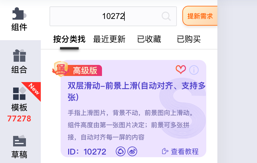 登录i排版SVG编辑器后,点击编辑器左侧「组件」按钮,在「滑动」分类中找到「双层滑动-前景上滑(自动对齐、支持多张)」组件,或者直接搜索组件编号10272,点击选择。