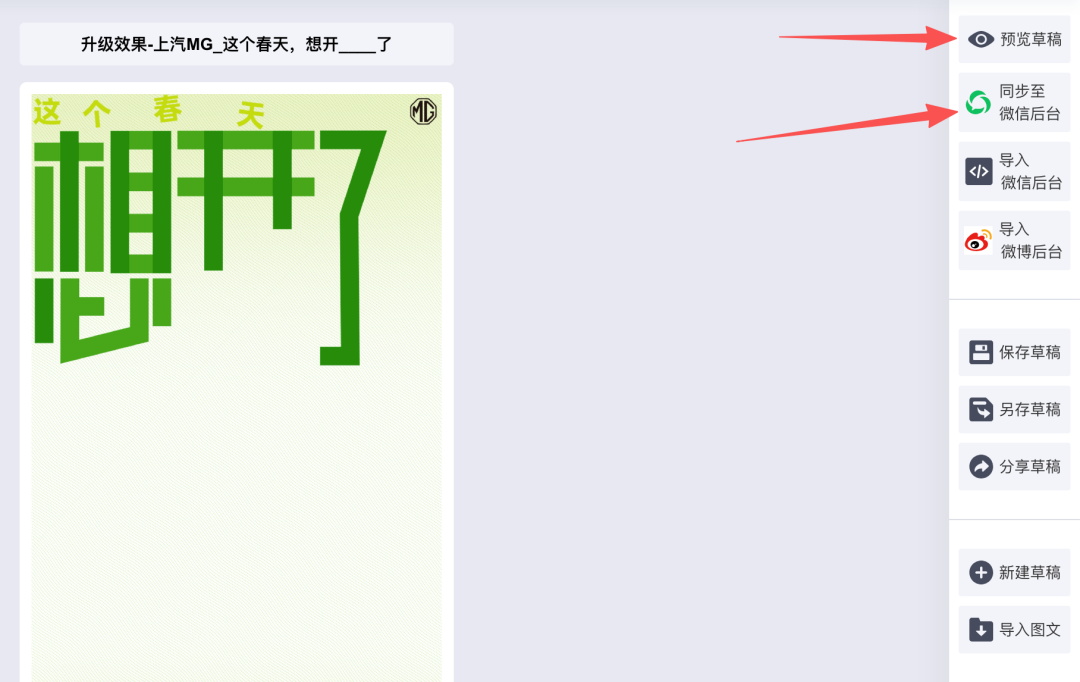 点击最右侧「预览草稿」预览效果,效果满意后点击「同步至微信后台」就可以了。
