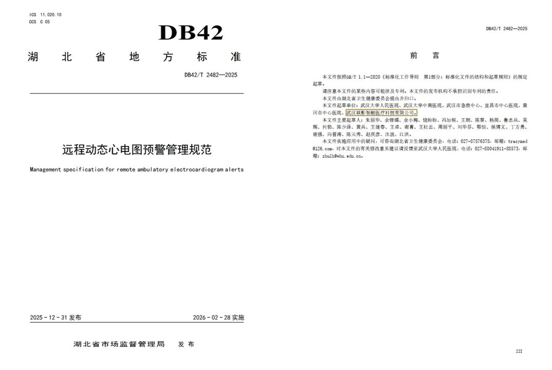 近日,由湖北省卫生健康委提出并归口,武汉大学人民医院牵头起草的湖北省地方标准《远程动态心电图预警管理规范》(DB42/T 2482-2025)正式发布实施。联影智融作为唯一企业单位深度参与该标准制定,将多年来在远程动态心电领域的技术实践与基层服务经验融入标准体系,为全省远程心电监测规范化、智能化发展提供了核心技术支撑。