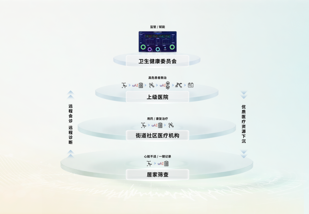 联影智融深度参与多地基层心血管健康筛查项目,从社区卫生服务中心到乡镇卫生院,让基层群众在家门口就能完成远程动态心电检测:居民在基层医疗机构佩戴设备后,居家检测的心电数据可实时上传,由三甲医院专家远程完成诊断;针对筛查出的高危患者,可快速启动转诊绿色通道,实现从社区筛查到医院救治的无缝衔接,真正打通了远程心电服务的 “最后一公里”,也为《远程动态心电图预警管理规范》的制定提供了真实、丰富的基层实践参考。