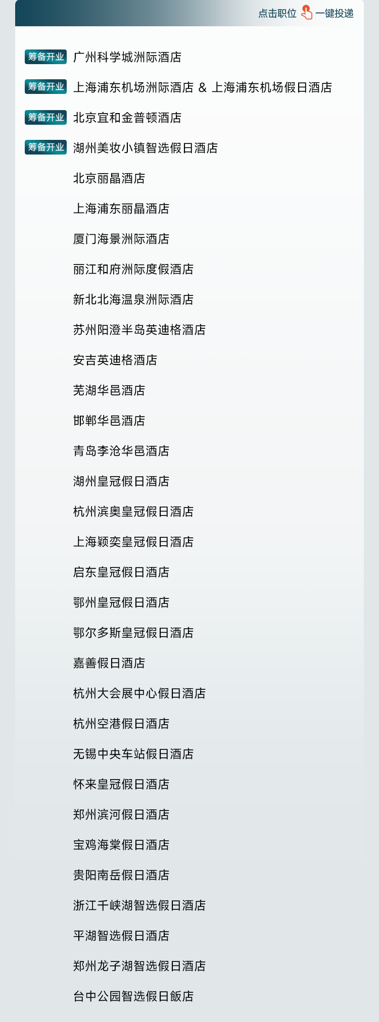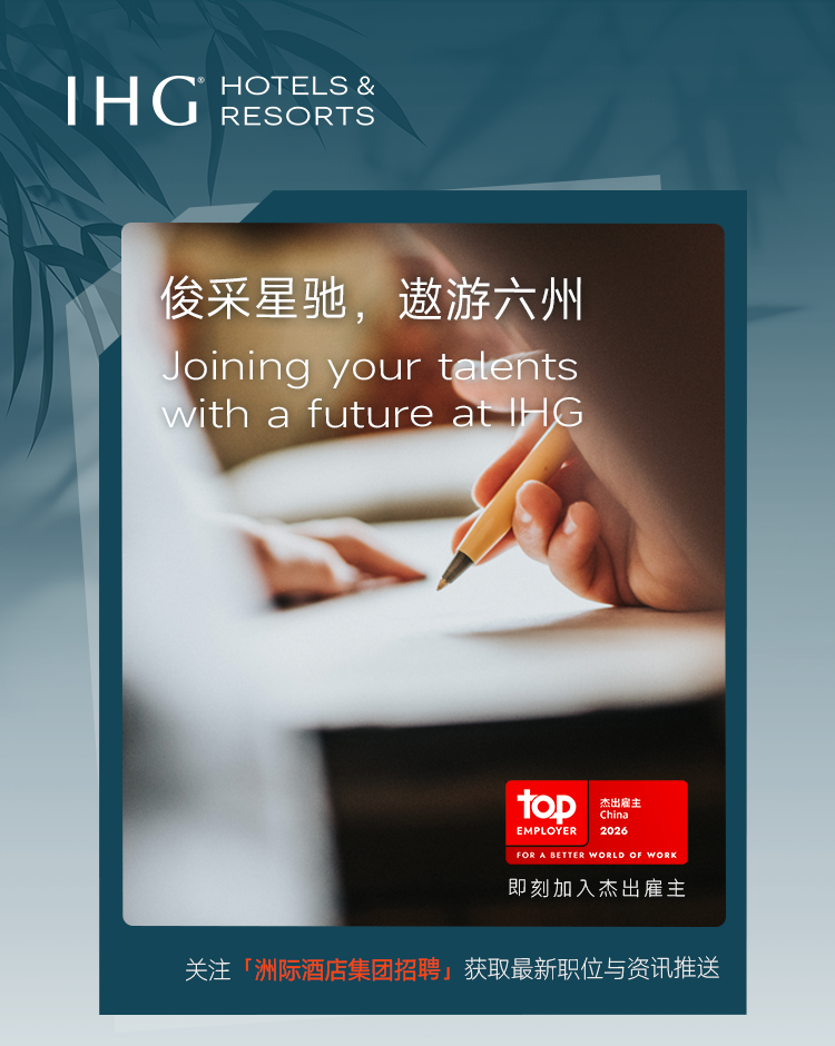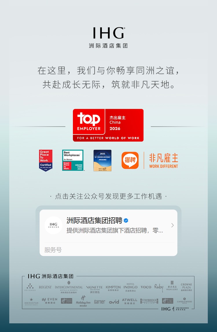 文章内容来源于公众号:洲际酒店集团招聘,点此可查看原文,内容版权归相关企业所有,本网站仅供交流学习。若涉及版权问题或存在侵权情况,请及时与我们联系,我们将第一时间进行删除处理。