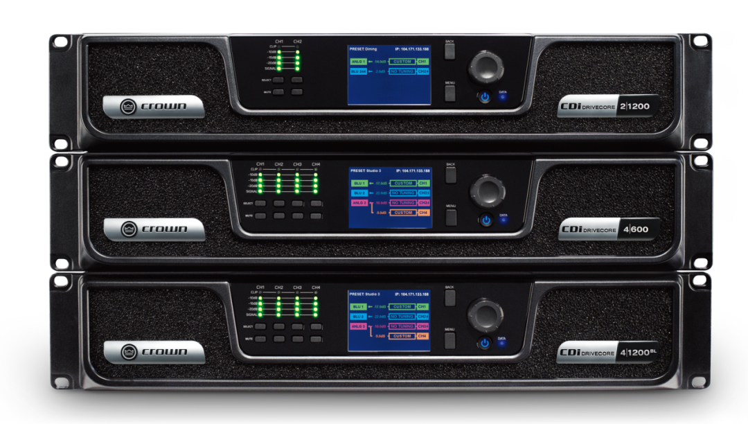 Crown CDi 4|600BL网络功放,适用于驱动分布式扬声器系统,为多个分会场提供稳定、纯净的功率输出。Crown CDi 4|1200BL网络功放,则为需要更大驱动力的主扩声区域提供充沛动力。