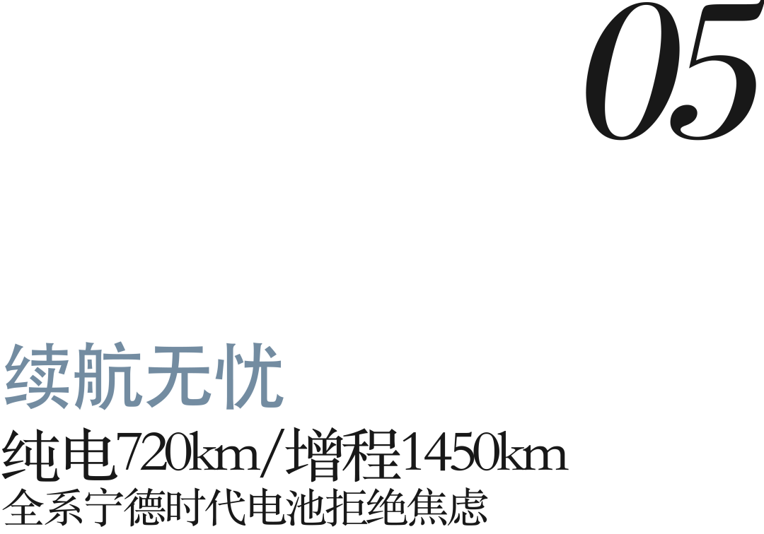 续航焦虑是新能源用户的核心痛点,全新阿尔法S5提供纯电、增程双动力选择,全系标配宁德时代电池,以超长续航与超快补能,彻底打消用户顾虑,实现“通勤无压力,远行不焦虑”。