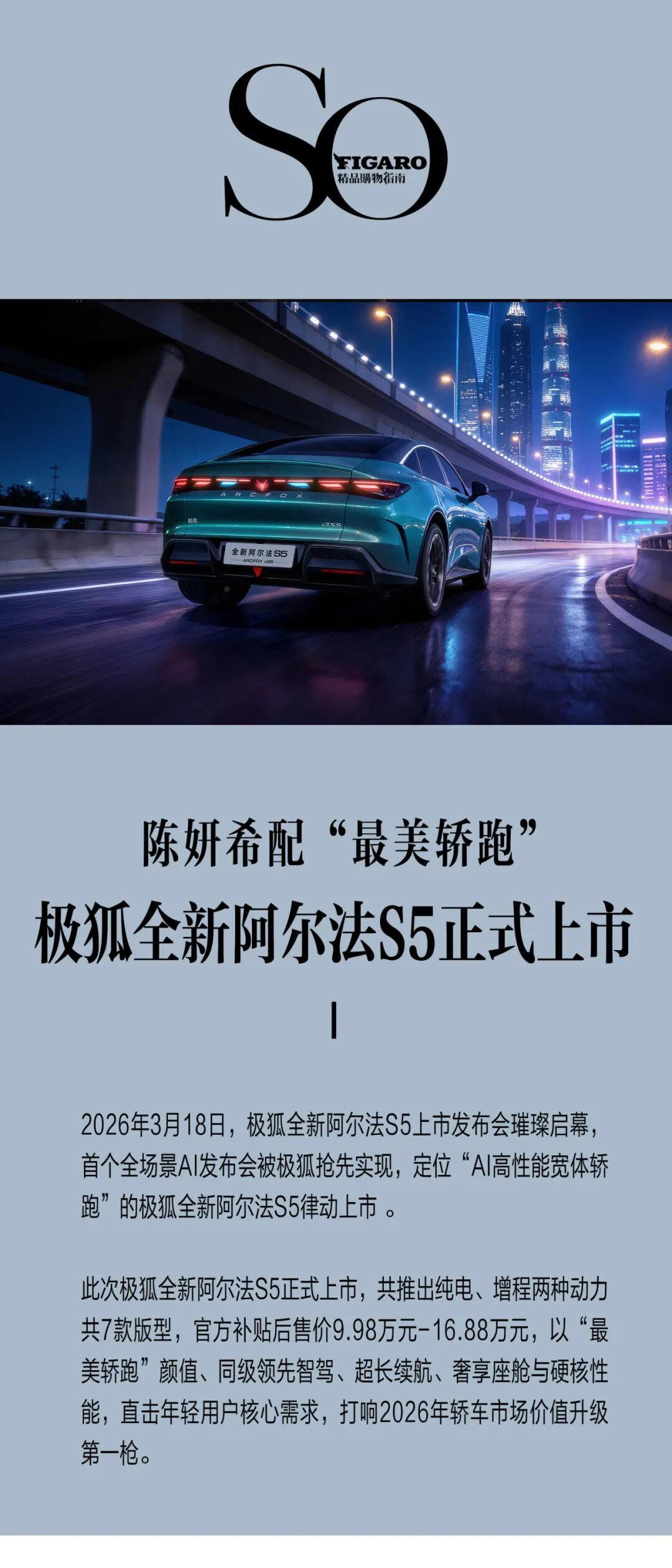 而新车官方补贴后售价9.98万元起的定价、纯电/增程双选择、11万级城区NOA、720km/1450km超长续航、3.7秒零百加速、4D SPA座舱,全新阿尔法S5以全方位越级实力,成为2026年轿跑市场的“破局者”。搭配陈妍希的明星效应与品牌诚意礼遇,这款“年轻人第一台AI高性能宽体轿跑”,必将成为年轻用户的首选座驾。