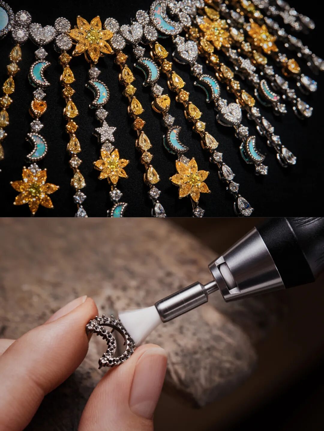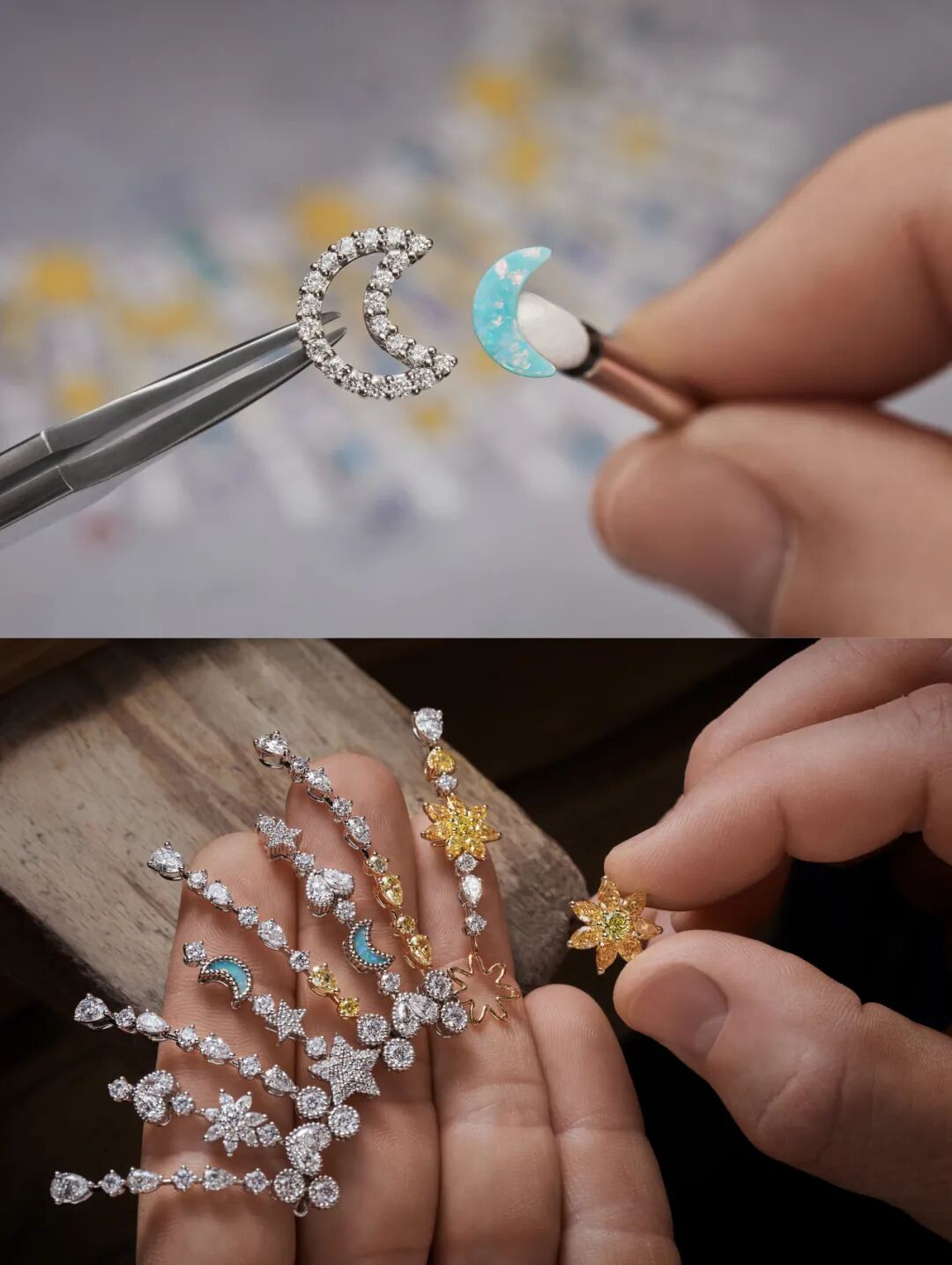 德卡斯特兰特选拥有变彩的欧泊模拟出皎洁月光,运用双层宝石工艺,将其置于相同造型的绿松石之上,清冷的月光瞬间染上了神秘的蓝绿色调。最后,珠宝工匠将不同切割方式的钻石、星星、月亮、花朵、爱心元素铰接串联。