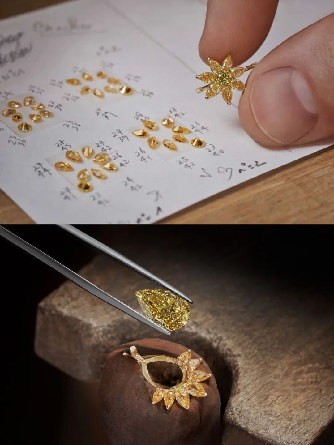 穗带上的小花所用的宝石由宝石工匠一一甄选,编号并摆放整齐,以确保所有花朵在色调上统一。项链的中心坠饰了一枚艳彩梨形切割黄钻,并点缀多枚梨形切割橘色钻石,散发出如骄阳般的炽烈光彩。