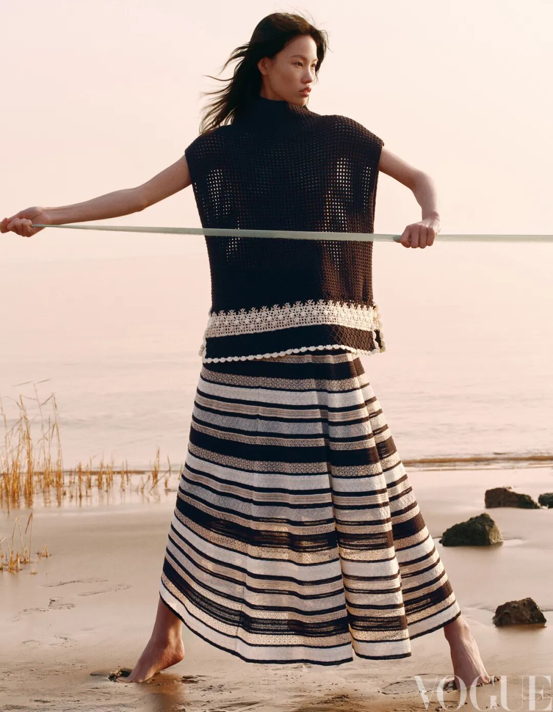 手钩网格拼色背心、条纹宽松长裙 均为Nan Knits