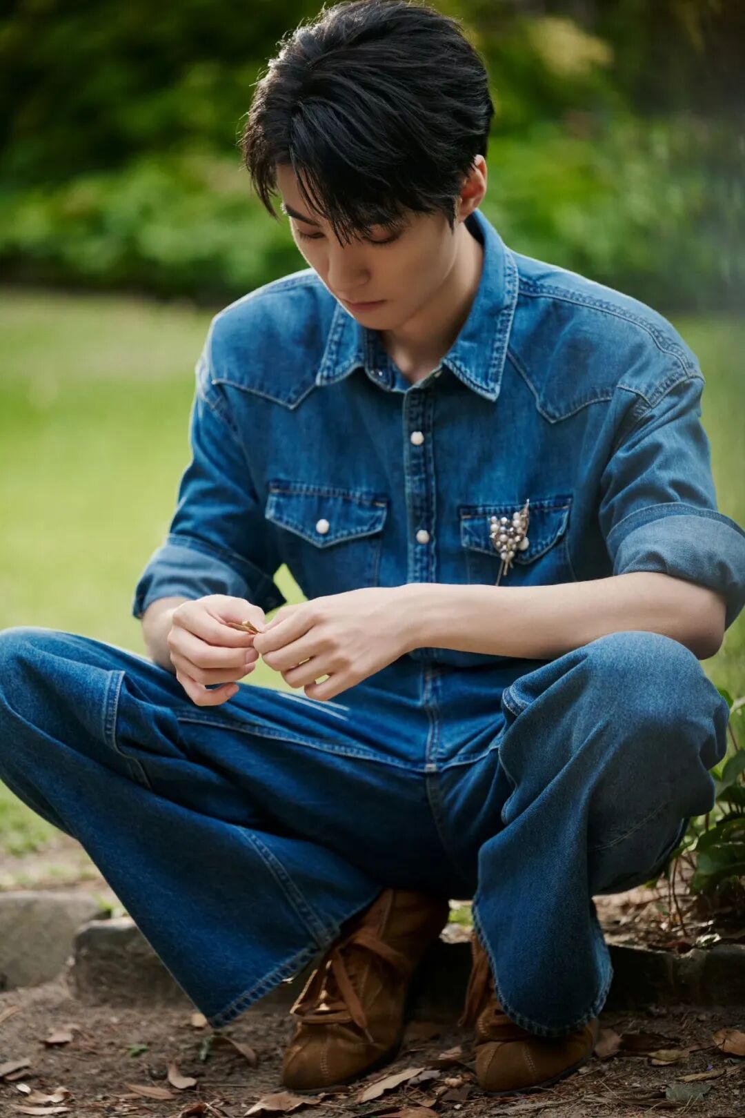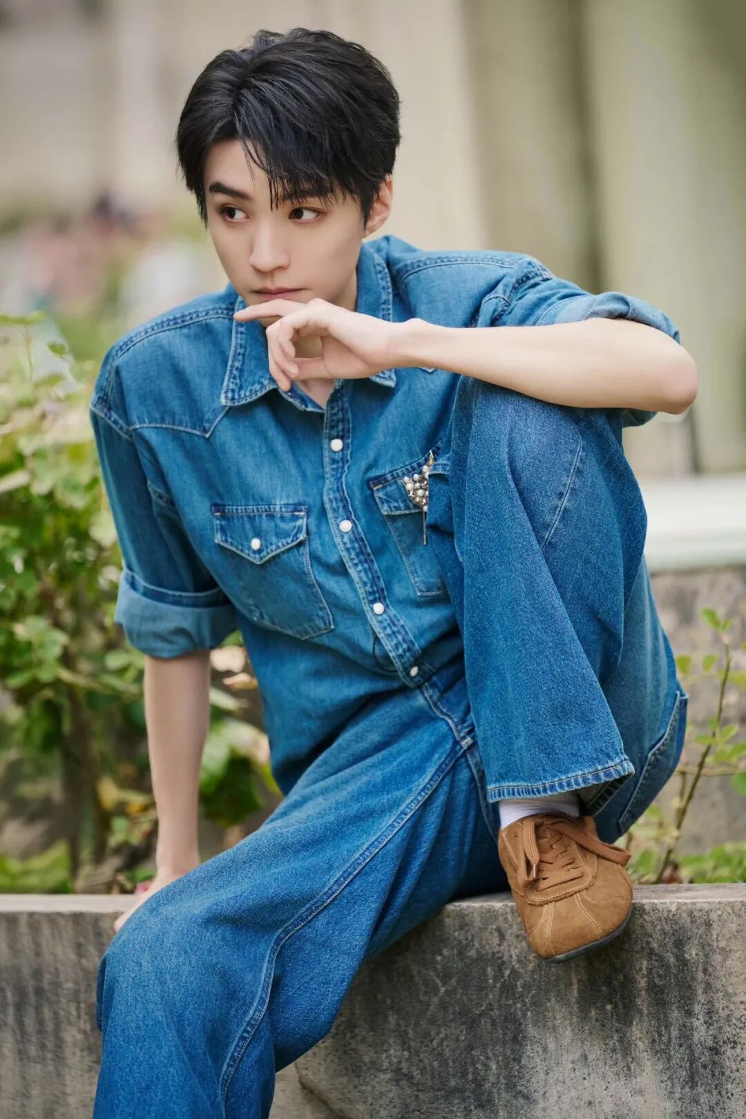 也可以像王俊凯一样搭配牛仔套装,棕色鞋履撞色复古蓝,两个颜色便拿捏春日 Outfit,这不得来一场“酣畅淋漓”的 City Walk?