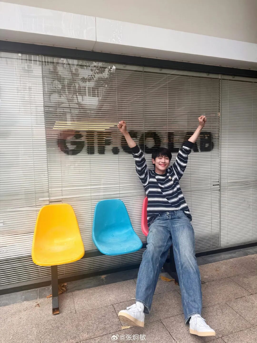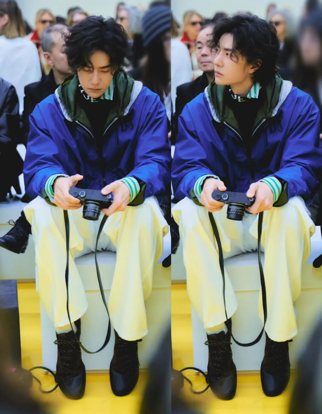 章昊出行时则从色系出发,提取蓝色运用全身,一双 FILA FUSION 复古学院风的鞋履轻松 Match 整体造型,春天当然要多穿点“彩”!