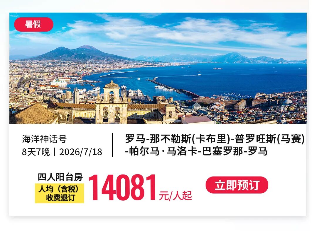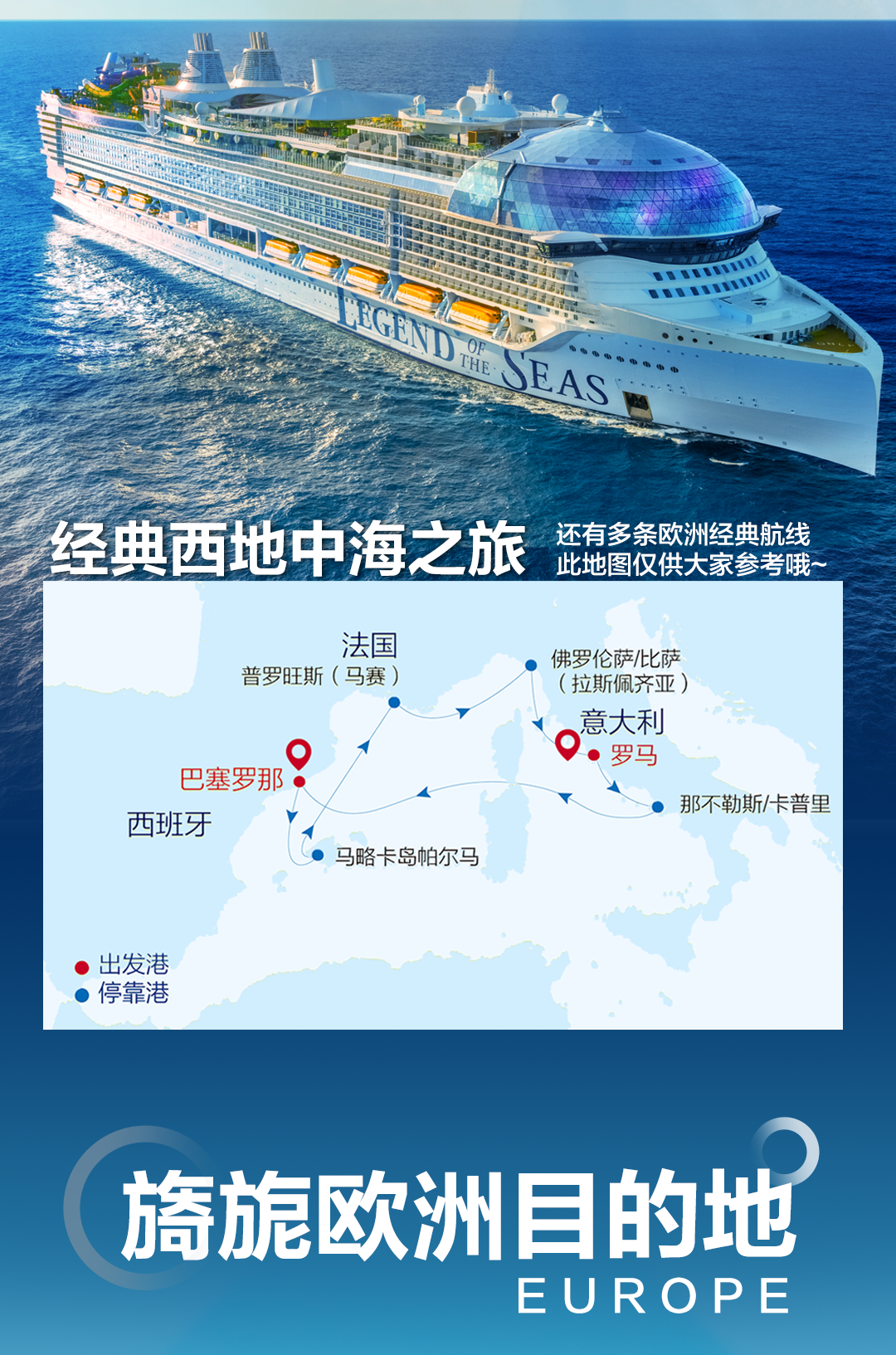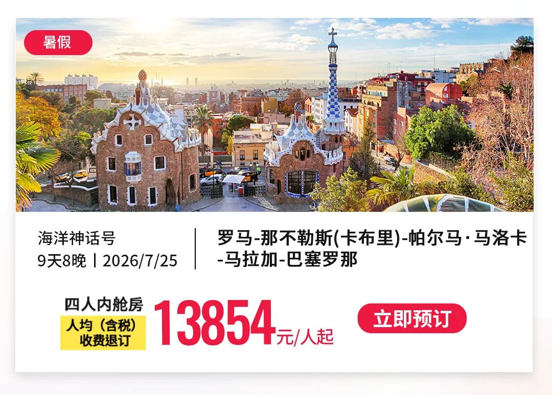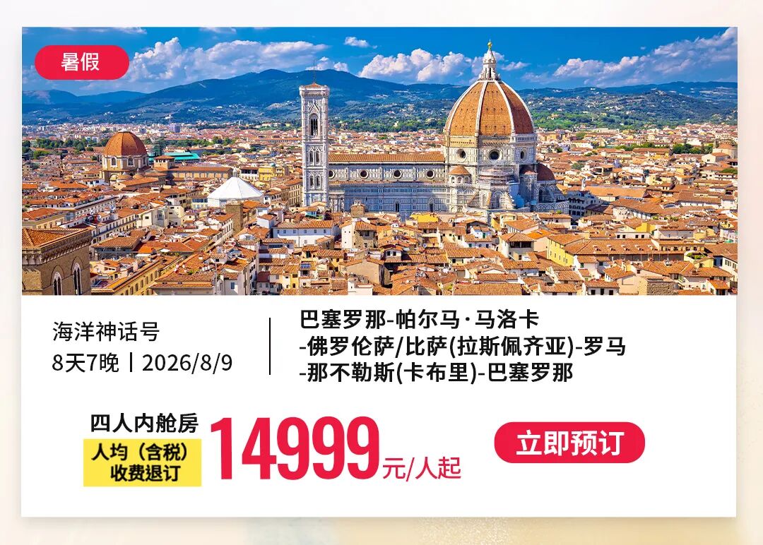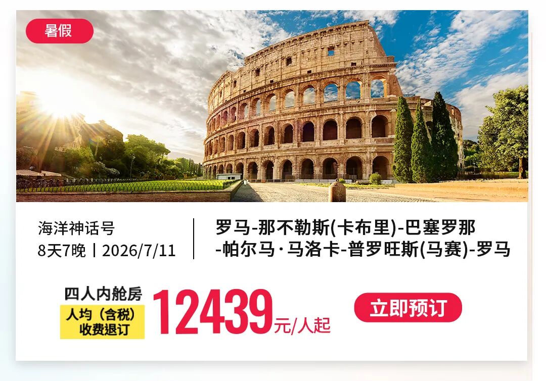 摘要:皇家加勒比游轮海洋神话号玩转欧洲7城,罗马、巴塞罗那、佛罗伦萨等超多网红目的地 + 特色美食,等你来打卡~