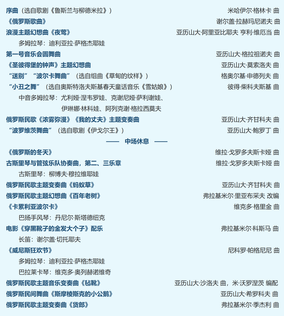 本场演出以历史回响与当代表达为主线,精选格林卡、拉赫玛尼诺夫、格拉祖诺夫等大师的经典之作。从歌剧序曲的辉煌、浪漫旋律的深沉,到圆舞曲的优雅、民族室内乐的精致,勾勒出丰厚的艺术脉络。
