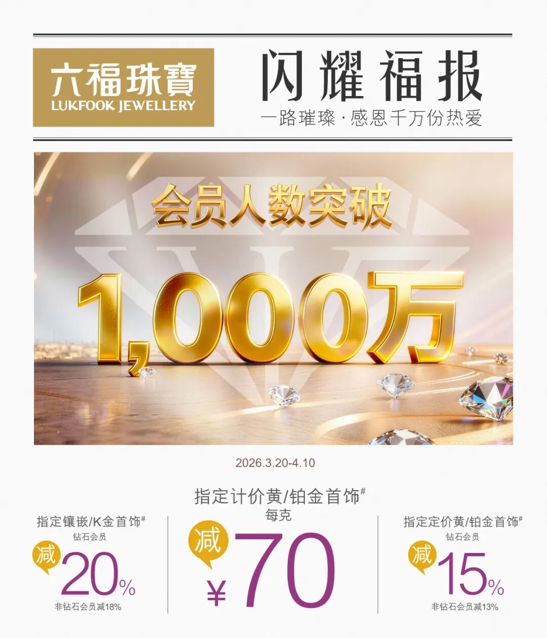 以上优惠仅适用于中国内地指定之六福珠宝实体店铺;以上折扣优惠均以商品标签价格及当天六福珠宝全国统一金价为计价基础;推广期内货品、特价、授权精品、电铸摆件、添富金不参与;除会员积分、会员积分抵扣计划外,不可与其他优惠同时使用;会员任意消费即可获得兑换资格,兑换活动于星期五(3.20、3.27、4.3)早上10时在会员小程序「积分商城」-「活动专区」上架,礼品共300份,分3次上架【3.20上架礼品:Keep VIP季卡(A00319)/时款 925银吊坠(A00320)、3.27上架礼品:网易云音乐黑胶VIP季卡(A00321)/ 925银钻石串饰(A00322)、4.3上架礼品:优酷 VIP季卡(A00323)/时款 925银吊坠(A00324)】,每次每款上架50份,每次上架合计100份,兑完即止,每位符合条件之会员以消费记录及手机号码作为判断基准,推广期内每位会员仅限兑换1次及换领1份,积分一旦扣除不作退回,逾期未兑换视为自动放弃,更多详情可查阅「积分商城」内产品详情及换领细则;钻石会员(包含白钻、彩钻及金钻会员,银卡会员除外)任意消费即可获得抽奖资格,以消费时之会员等级作为判断基准,每位钻石会员仅限获得1次抽奖机会,推广期结束后于符合参与抽奖资格者中随机抽取10位,各送出指定18K金钻石吊坠1份(价值:¥3,370),实物奖品仅限于中国内地指定之实体店铺领取,中奖名单将于2026年4月22日或之前,在会员小程序内公示及短信通知,中奖者须于2026年4月26日或之前进入会员小程序-「有奖互动」-「活动奖赏」进行查看及点击领取,逾期未点击领取或未选择店铺视为自动放弃,确认领取店铺后,奖品将于2026年5月10日或之前邮寄至选定店铺,奖品到店后由专人通知中奖者领取,中奖者需自行至选定之店铺进行签收领取,如中奖者自身原因导致未能成功通知或于礼品派发至「活动奖赏」起3个月内未能前往店铺签收领取,将视为自动放弃该奖品;会员活动适用于中国内地指定之六福珠宝、六福精品廊、Love LUKFOOK JEWELLERY实体店铺、福满传家及Goldstyle专门店;活动过程中,因会员退货或遇用户恶意作弊,通过其他不正当手段(包括但不限于使用三方软件或利用系统漏洞等)参与活动,本司核实情况后有权取消其参与资格,并回收用户已获得的礼品,必要时追究法律责任;六福集团之员工均不得参与上述会员活动,以示公允。更多活动详情请向店员查询;图片仅供参考。