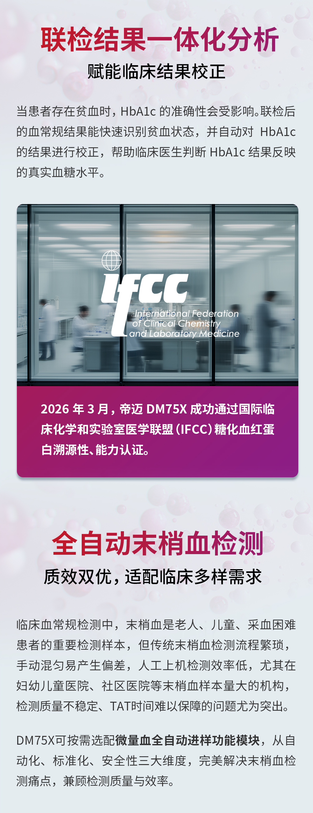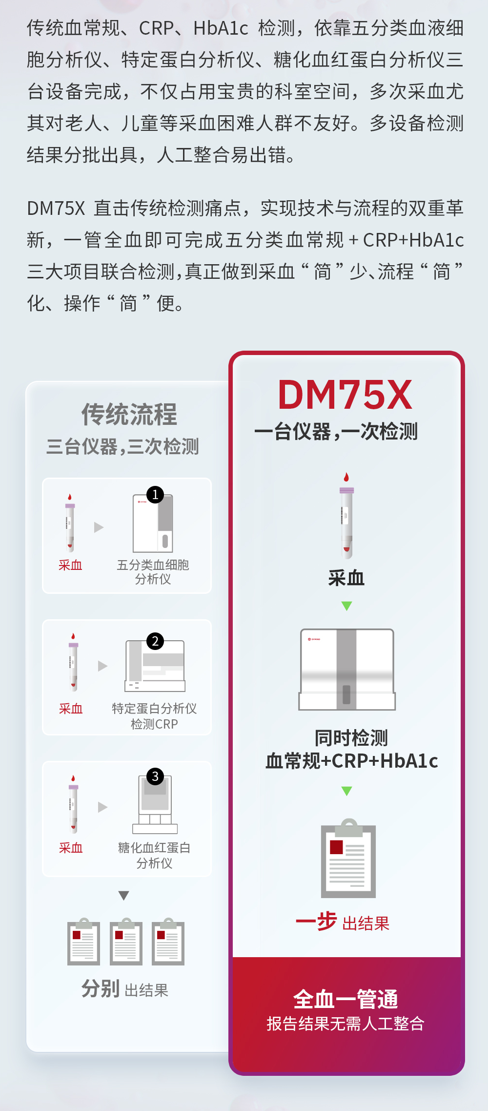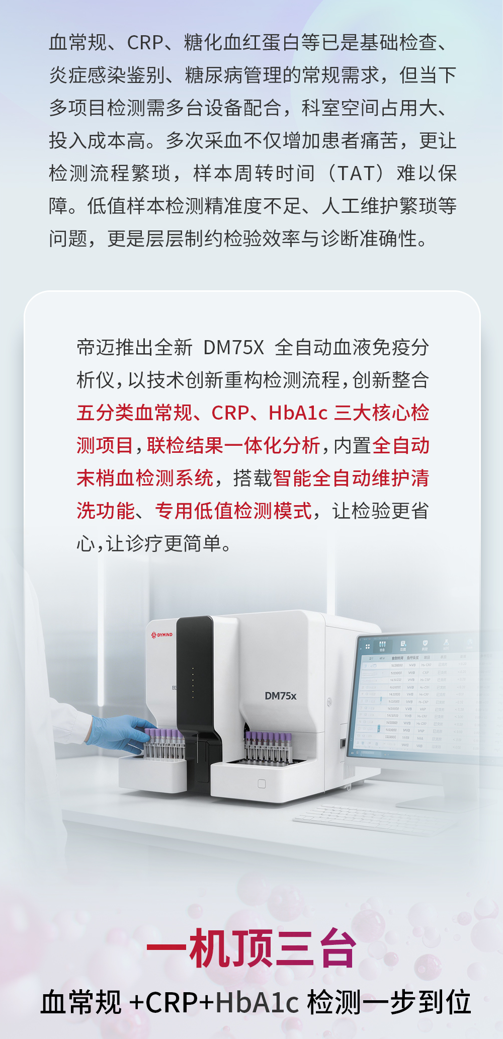 摘要:帝迈推出全新DM75X全自动血液免疫分析仪,以技术创新重构检测流程,创新整合五分类血常规、CRP、HbA1c三大核心检测项目,联检结果一体化分析,内置全自动末梢血检测系统,搭载智能全自动维护清洗功能、专用低值检测模式,让检验更省心,让诊疗更简单。