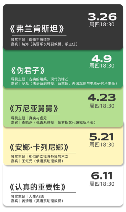 本届艺术季,讲堂与外国语学院联合推出“舞台上的世界文学名著”戏剧美育公开课。精选五部由世界文学名著改编的戏剧影像——《弗兰肯斯坦》《伪君子》《万尼亚舅舅》《安娜·卡列尼娜》《认真的重要性》,邀请英语系、法语系、俄语系学者进行映前导赏。影像放映之前,先听学者讲;文学读本之外,再看舞台演。让文字在光影中苏醒,让经典在跨文化的视野里,焕发新的生命。