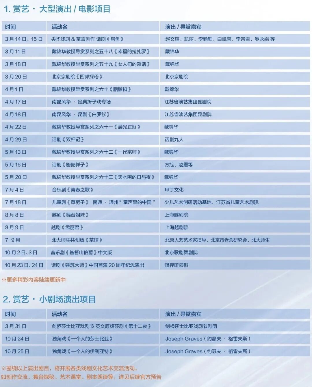 此外,音乐剧《青春之歌》、儿童剧《草房子》、北大师生研学版《茶馆》也将陆续登场,敬请期待。