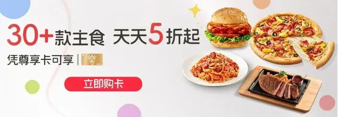 1.凭本权益在必胜客欢乐餐厅或通过必胜客宅急送官方网络订餐渠道,以单品价点购指定精选主食1份,可享5折起优惠。不同主食可获享的单品价折扣优惠均有所不同,请以点购时菜单实际显示内容为准;折扣金额及对应产品可能不定期调整,详见菜单内尊享卡权益标识。