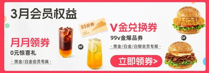 ①必胜客黑金/白金会员:可兑换5元神券1张,或20元神券1张,或9.9元汉堡2选1V金爆品券1张。