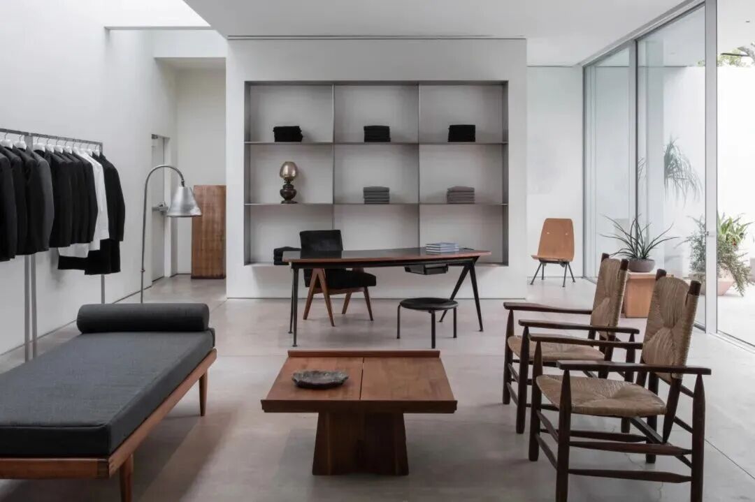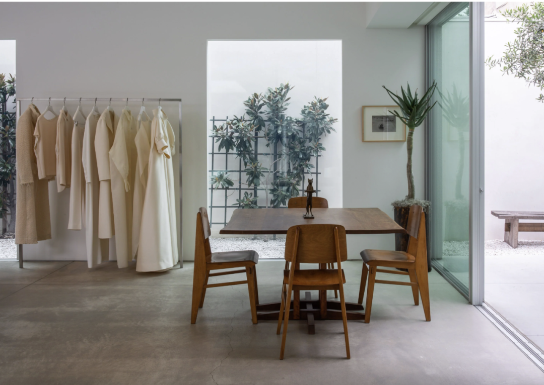The Row 洛杉矶旗舰店也展现出类似的转变。在这里,服装被宽松地摆放,家具陈设极简,色调刻意低调柔和。没有任何一件物品刻意吸引目光,却处处透着精心设计的巧思。通过剔除视觉干扰,空间让每一件单品都能被单独审视,也让人们的互动变得更从容、更用心。