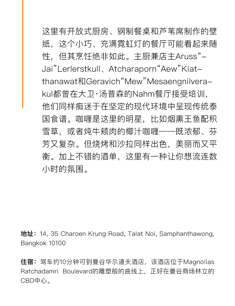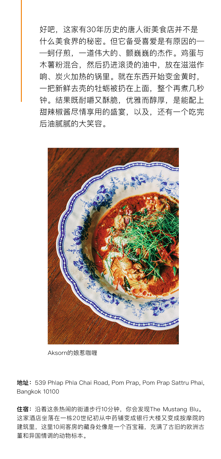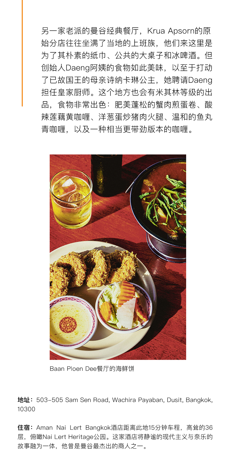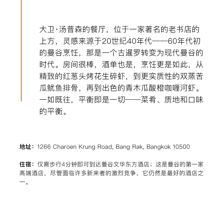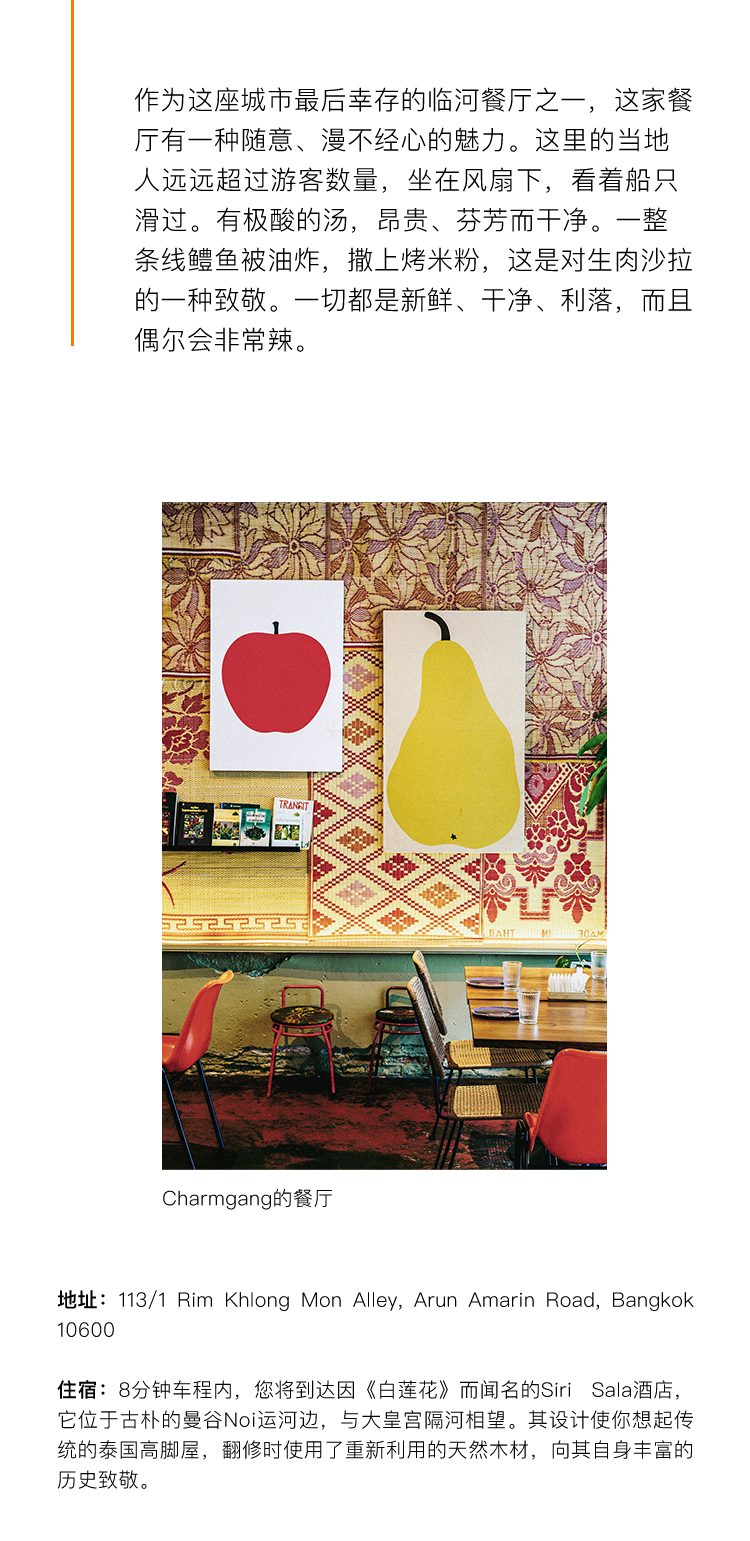 这里的食物令人惊叹:蟹黄炒辣椒;更多的汤,如同美人鱼的叹息般精致;气味浓烈的鱼咖喱,带着水手休假时的那种狡黠的自信。“我们泰国人期待美食。”塔农萨克说,“而在这样的地方,美食是理所当然的。”