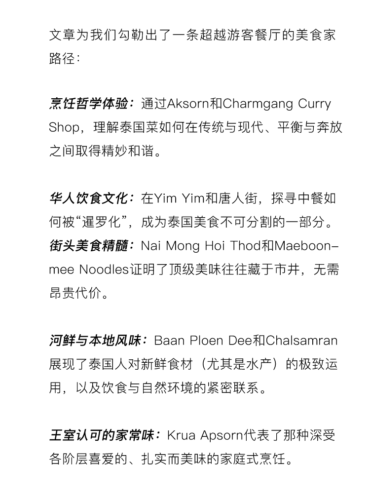 邮件继续写道:“不仅仅是烹饪的具体行为和味觉的愉悦。其中有文化和精神的元素,是所有组成部分之间的联结,是泰国信仰与传统体系的核心,是感性、传统与超自然的疯狂混合。”接着是对仪式的一段冗长描述,然后是他的结束语:“但在外省进行神圣的嬉戏之前,我们将从平凡和曼谷开始,花几天时间在城里逛逛,好好吃几顿。”