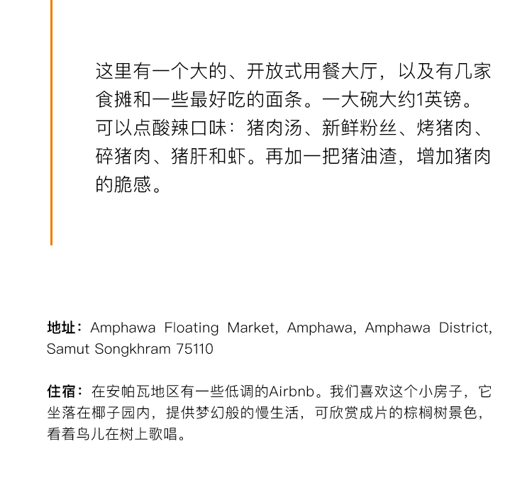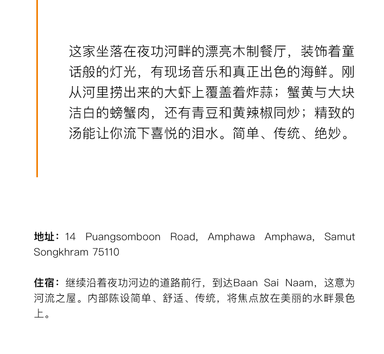 第二天,我们穿过节日的车流,前往夜功河畔著名的水上市场安帕瓦。窗外是数英里发白的盐滩。该地区以优质的海鱼和河鱼闻名,还有棕榈糖和水果:荔枝、芒果和椰子。我们在Maeboonmee Noodles停下来吃面条,虽然便宜,但这却能让生活更充实。然后去Chalsamran餐厅吃晚餐,餐厅悬在夜功河上,装饰着童话般的灯光,我们在那里大快朵颐,享用就在几米外捕获的河虾,与此同时,另一只巨大的巨蜥懒洋洋地伸展在菩提树的枝桠上凝视着我们。
