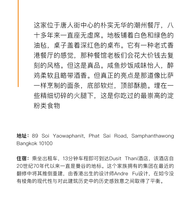 接下来的几天,我们骑着租来的摩托车在城里穿梭,这是冲破永远便秘般的交通的最佳方式。我们在几十年未变的老唐人街的经典餐厅吃午餐,享用醉鸡和咸鱼饭,还在Chop Chop Cook Shop停留,这是大卫对曼谷中餐的致敬与迷恋。“面条是中国的,炒菜是一种中国技法。”他说。大多数街头小吃也源自中国。泰国人善于吸收其他文化并使其变成自己的,他们把一切都‘暹罗化’了。”