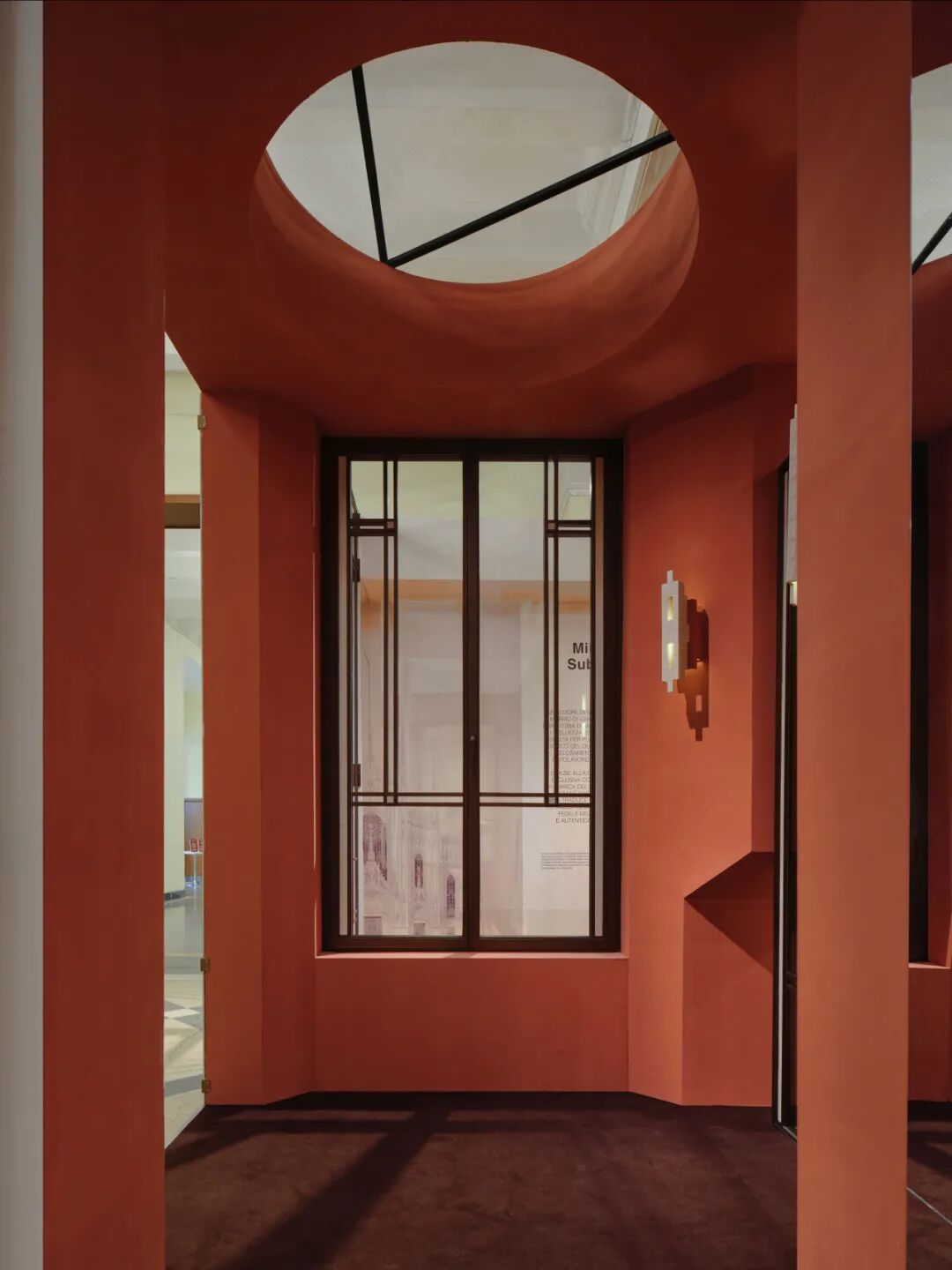 与常规展厅直接展开、密集陈列的模式不同,FRAME SHOW 的巧思从踏入玄关的那一刻便已开始。空间被刻意收紧,暗红色的界面形成视觉上的短暂停顿,仿佛在引导观者褪去外界的浮躁,调整节奏再赴这场设计之约。顶部天窗巧妙收拢自然光线,搭配低位光源的柔和铺陈,让空间节奏悄然放缓,每一步前行都成为一次沉浸式的感知体验。