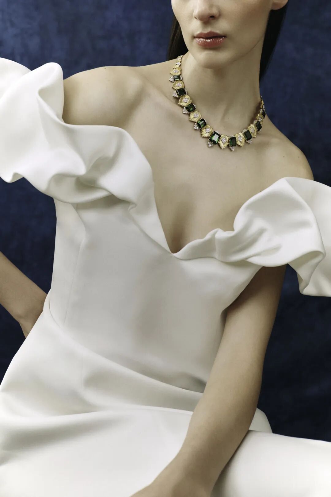 当我们试图拆解这些“爱的语言”时会发现,珠宝品牌之所以能成为时代的注脚,往往在于它们总能精准捕捉到某一种爱的情绪。格拉夫素有“钻石之王”之称,是众多名流选择的婚庆珠宝。亚历山德拉在摩纳哥佩戴的蝴蝶系列,以对称美态为灵感,钻石勾勒的蝴蝶在光影间翩然欲飞,与婚纱刺绣彼此呼应。耳畔同系列耳环顺势而上,灵动轻盈;指间钻戒璀璨夺目,与颈间项链共同书写浪漫篇章。如果说格拉夫是浪漫的具象化,那么CINDY CHAO则是艺术的抽象表达。赞达亚出席奥斯卡的这身造型,打破了传统红毯珠宝“堆砌宝石”的定式。树枝的意象,象征着生长与羁绊,而新材料的运用则代表了现代女性打破常规的力量感。这是一种更有深度的“璀璨”,它不仅照亮外表,更映照内心。