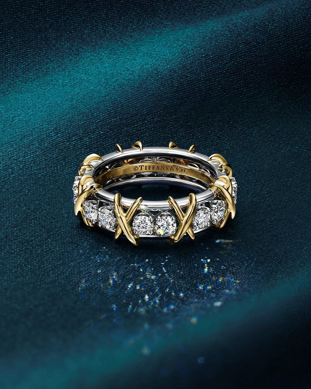 卡罗琳的永恒戒开创了低调的审美方向,而蒂芙尼则在更早之前便埋下伏笔。品牌代言人娜塔莉·波特曼佩戴的Sixteen Stone十六石系列,出自传奇设计师让·史隆伯杰,以十字绣图案为灵感,致敬家族纺织传承。系列作品需由经验资深的工匠悉心打造,八组十字绣纹样在十六颗钻石之间有序排列,从任何角度都精致耐看。或许,蒂芙尼的“十六石”与卡罗琳的永恒戒,共享同一种精神内核:不以单颗钻石强调瞬间震撼,而以连续排列的光芒,象征日复一日、绵延不断的陪伴与爱意。