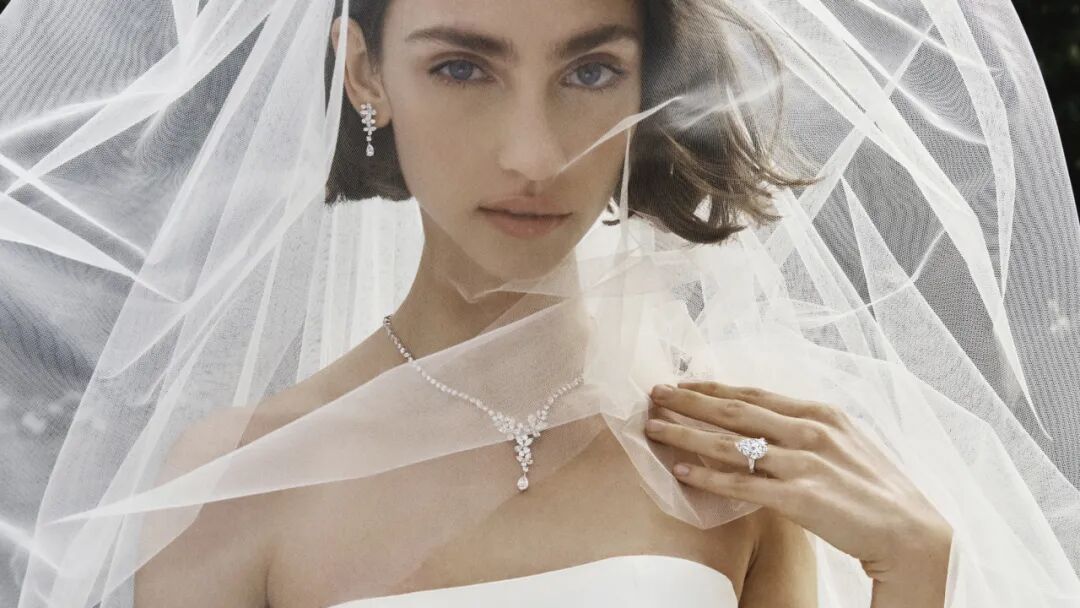新娘佩戴Graff格拉夫经典蝴蝶系列钻石项链、戒指。