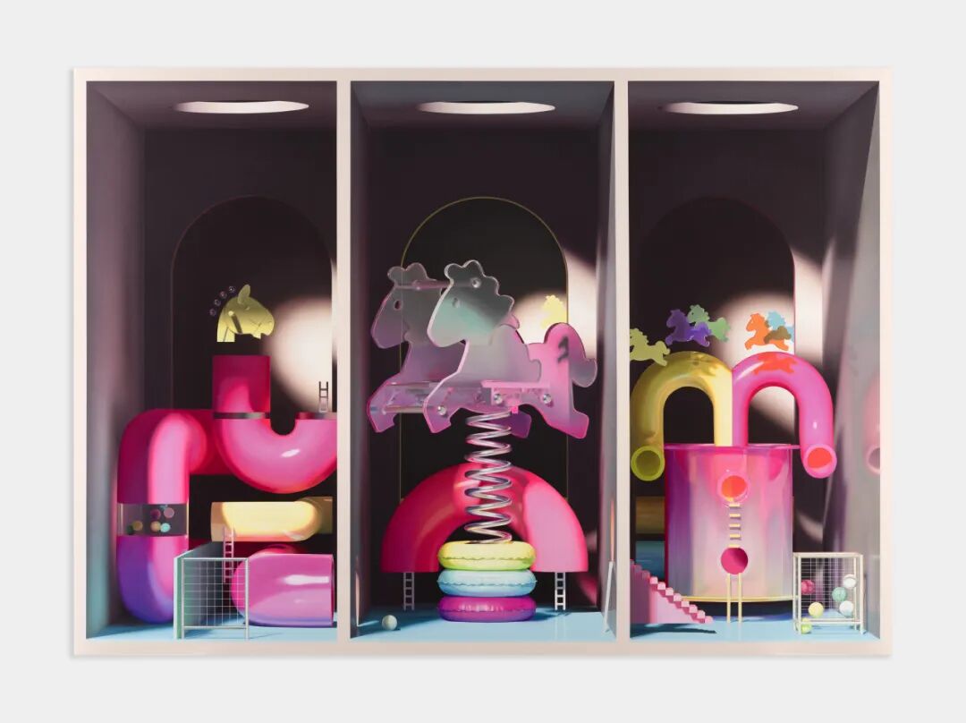 这是贝浩登画廊在亚洲开始代理该艺术家后的首次重要呈现,在展位特别为他设置了一个独立单元。这件作品以他标志性的“游乐场结构”为核心,游乐设施被置于一个封闭、几何精确的盒状空间中,由上方天窗投下冷静而戏剧化的光线。画面高度饱和却异常安静,没有人物,处处指向“人”的缺席。熟悉的童年装置被转化为一种心理空间:既是记忆的容器,也是某种被抽空后的存在状态,创造了介于怀旧与不安之间的情绪张力。