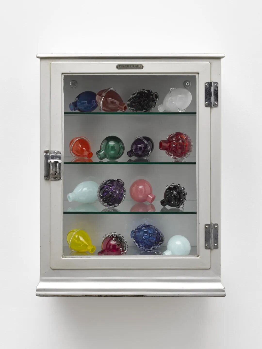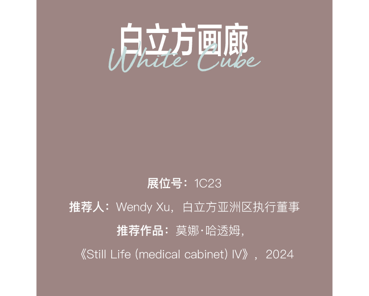 这次白立方在巴塞尔艺术展香港展会的展位中,非常值得关注的是来自莫娜·哈透姆(Mona Hatoum)的作品,她刚刚荣获2026年汉堡车站美术馆终身成就奖。此次我们带来的是一件2024年的作品,《Still Life (medical cabinet) IV》,也是艺术家持续创作的一个系列,各式各样的手榴弹形态以手工吹制玻璃重现,被呈现于医用柜中,犹如珍贵的物品,也带着不安的隐喻。去年,白立方首尔空间也举办了这位艺术家的个展,她出生于黎巴嫩的一个巴勒斯坦家庭,作品常常兼具诗意和时代隐喻,是一位非常重要的艺术家。她曾经在2015年荣获广岛艺术奖,这个奖项是为了表彰在美术领域为人类和平做出最大贡献的艺术家。她也曾在2019年获得31届高松宫殿下纪念世界文化奖之雕塑奖。目前,莫娜·哈透姆的展览正在米兰普拉达基金会(Fondazione Prada)举办。