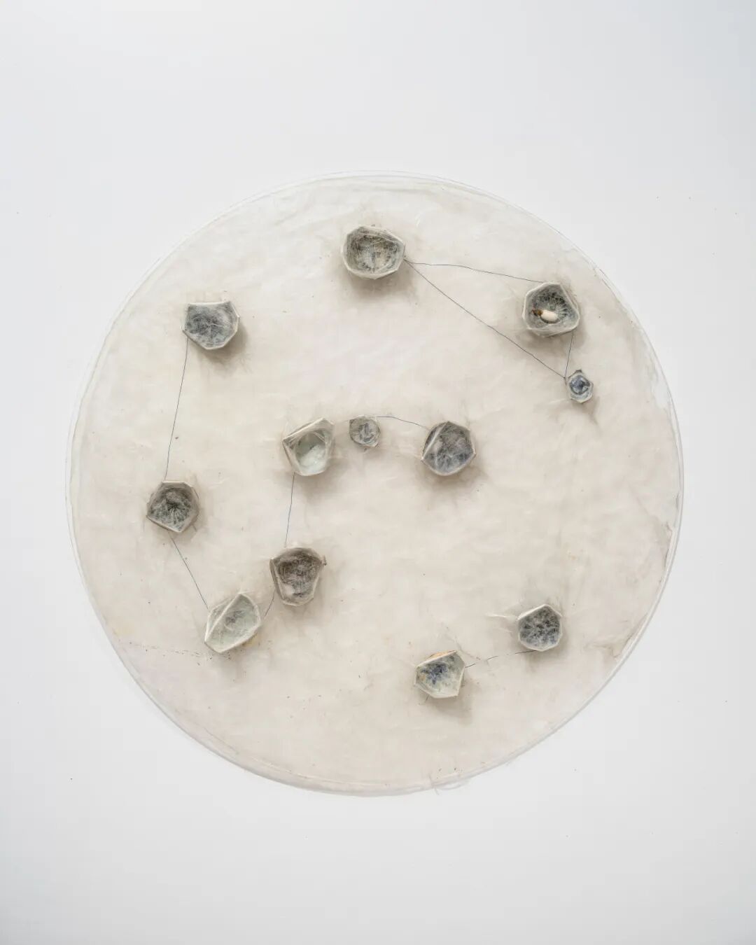 梁绍基自1980年代末开始进行养蚕艺术实验。三十余年来,他持续以蚕的生命历程为媒介、以与自然互动为特征,展开以时间、生命为核心的“自然系列”创作。作品充满冥想、哲思和诗性,呈现出一种虚透丝迹的内美。在这件作品中,从古窑遗址挖掘出的青花瓷片被带入创作,匣钵残片多有粘连成串,犹如蚕虫蠕动。梁绍基将其镶嵌于弥漫丝迹的透明耐力板上,在丝与光的对话中展开对浩瀚宇宙的想象。作为人造石的瓷片如星际巨石,在神秘的夜空中穿流、闪耀。丝、瓷、光、影彼此交辉,在勾勒宇宙星系的同时,也呈现出东方文化自然观的无限性。