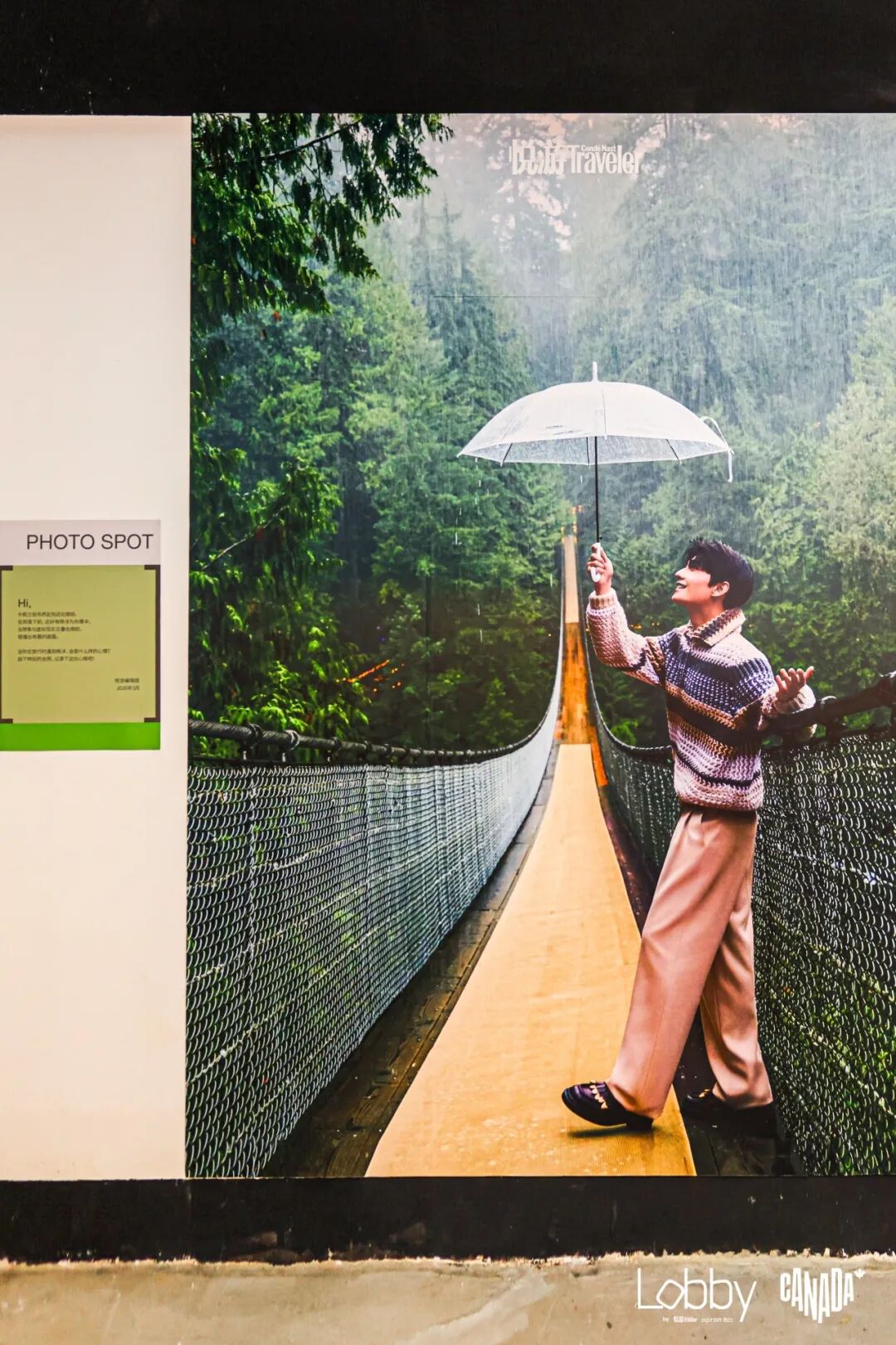 卡佩兰奴吊桥被还原在眼前。彼时,温哥华下起了雨,而此刻,在雨落下之前,杨洋为你撑起了伞。人们站在镜头之下,与杨洋共享一把伞,在想象与现实交叠的当下,完成一次短暂的同行。雨水、撑伞、并肩的姿态,这些原本属于画面中的叙事,在这里转化为身体可以进入的场景。某一刻,这段有趣的互动被摄影师捕捉下来,成为停留在当下的片段。