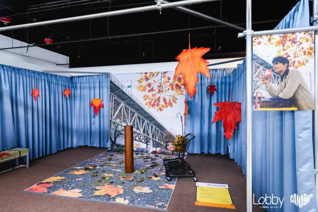 一侧的荧幕里,播放着杨洋在加拿大拍摄的影像。从卡佩兰吊桥的雨雾森林,到港口起落的水上飞机,他在斯坦利公园的海堤边骑行,他在格兰维尔岛的市集间穿行,上一刻,观众的视线还跟随着他的脚步行走;下一刻,盖士镇蒸汽钟旁铺满枫叶的街道已经在空间里展开,从墙面一直延伸至脚下。