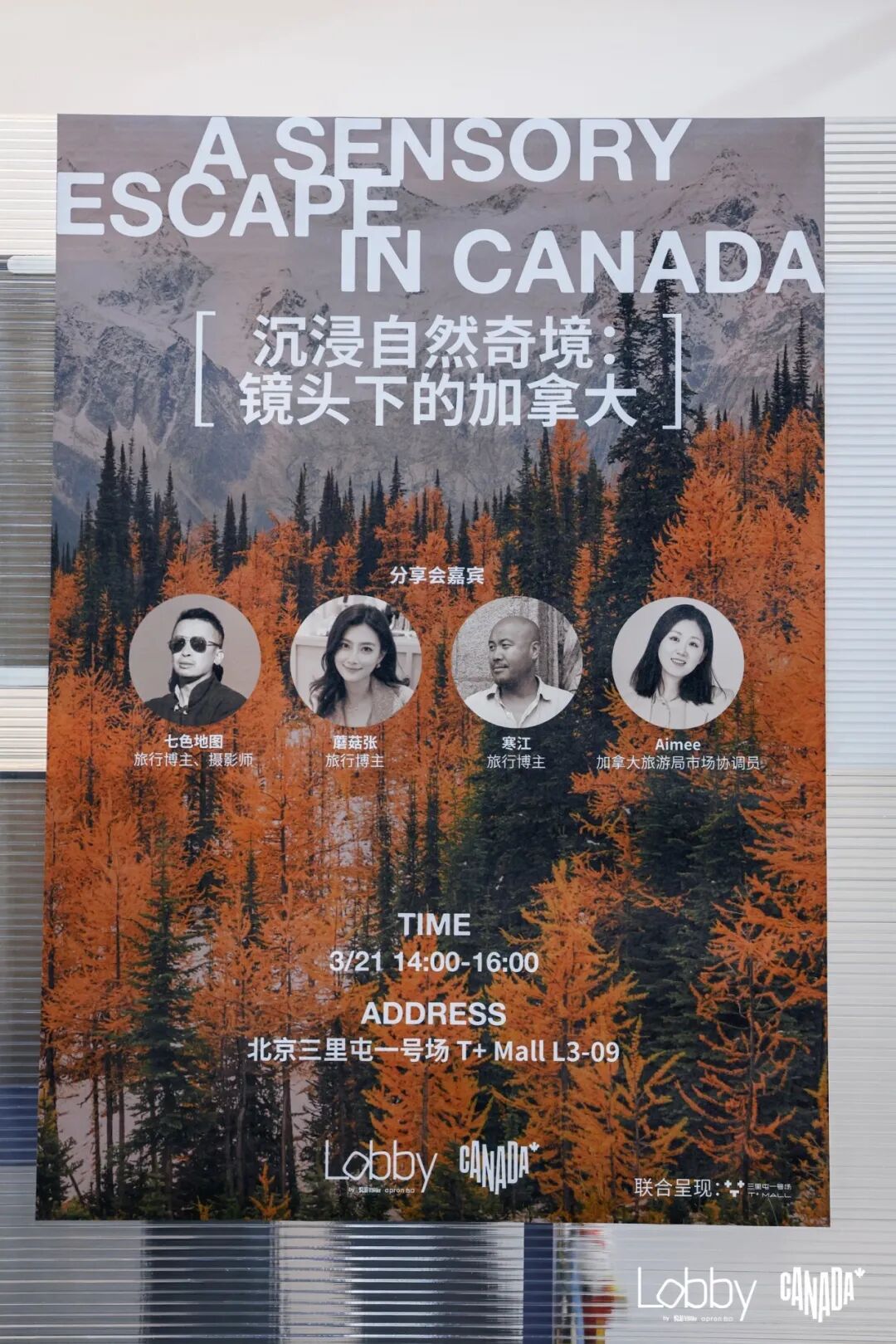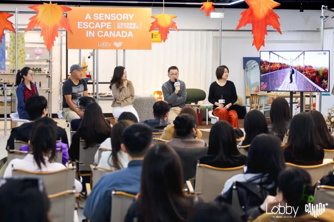 在沉浸式的五感漫游之后,这一主题也延伸到一场名为「沉浸自然奇境:镜头下的加拿大」的分享会。上周六,三位旅游博主——寒江、七色地图和蘑菇张来到Lobby,从各自的旅行经验出发,讲述他们所经历的加拿大。