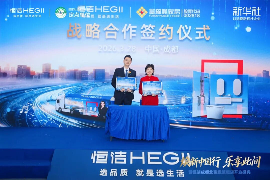 在恒洁与富森美战略合作签约仪式上,恒洁集团零售家装渠道总经理谢泽楷与富森美联合创始人/副董事长刘云华共同完成签约,双方将通过资源协同与渠道联动,持续推动家居品质消费。