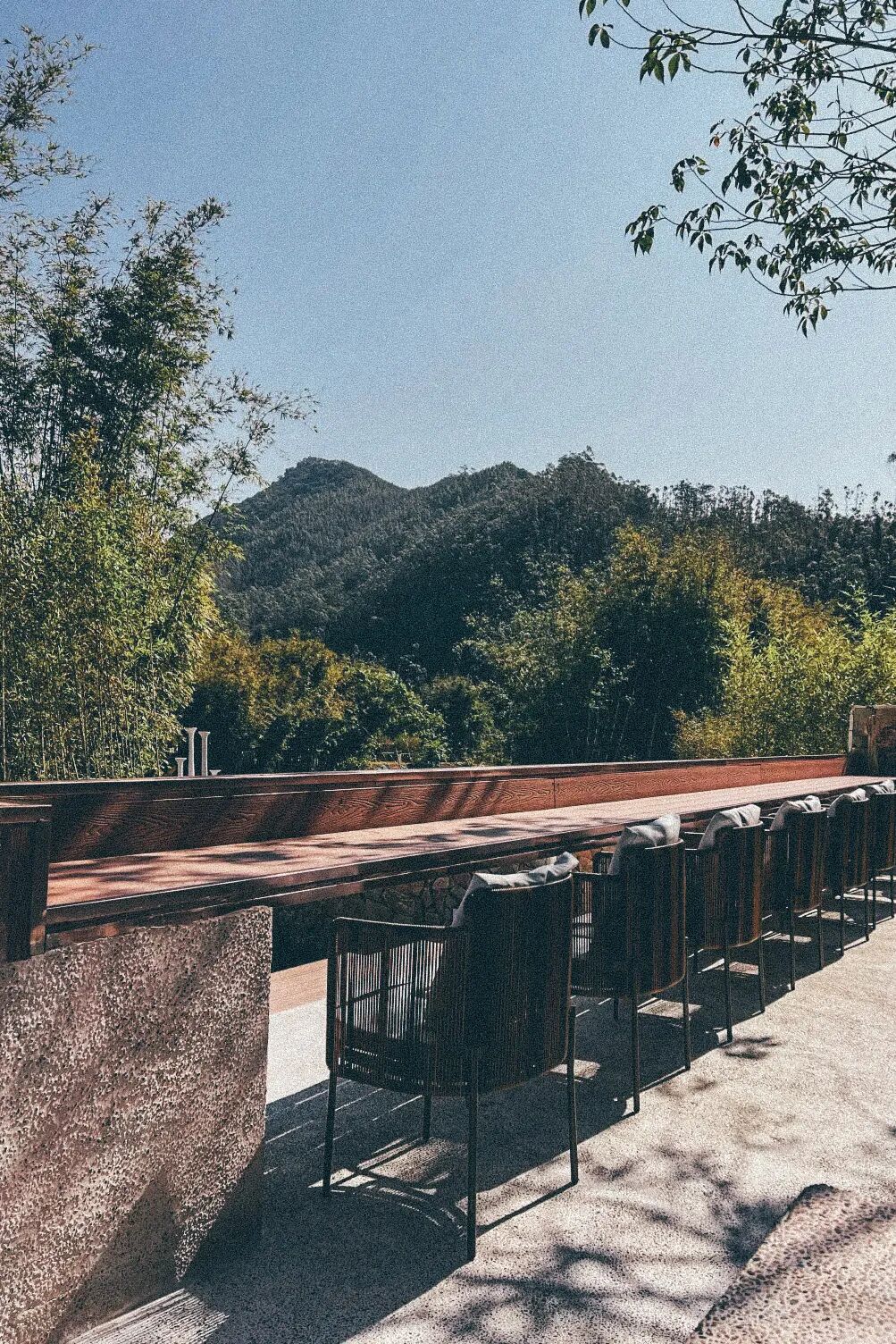 第一次到达时,很容易错过入口——院子被竹林半掩着,一条小溪从旁边流过,水声不急不缓。就如同苏轼那句“罗浮山下四时春”,而这里的气氛似乎也确实停留在某种恒久的春日里,十分舒展。民宿的建筑不算宏大,更像一组分散在山谷里的院落。房间内部是温和的木质与暖色灯光,没有太多复杂装饰,但窗户开得很大。推开窗时,竹林的绿色会直接涌进视线里,空气里有一点潮湿的草木味。