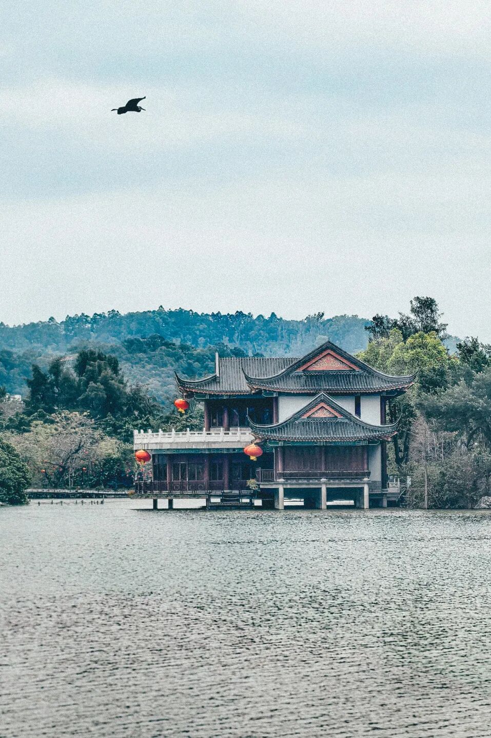 湖面不算很大,被城街轻轻环抱着,水边没有太多宏阔铺陈,多是细碎的步道、石桥与缓坡。西湖边最醒目的便是那座泗洲塔,也就是东坡笔下的“玉塔”。塔身在湖心的倒影,随着细碎的微波轻轻晃动,像是一枚沉入水底的古玉。冬天的早晨常常浮着一点薄雾,远山的轮廓被水气抹得很淡。若是冬日的下午,光线斜斜落在水面上,湖水会呈现出一种淡淡的灰蓝色,像一张铺开的宣纸。走在湖边的时候,会突然生出一种微妙的错觉——仿佛岭南的空气里,也悄悄长出了一点江南的影子。