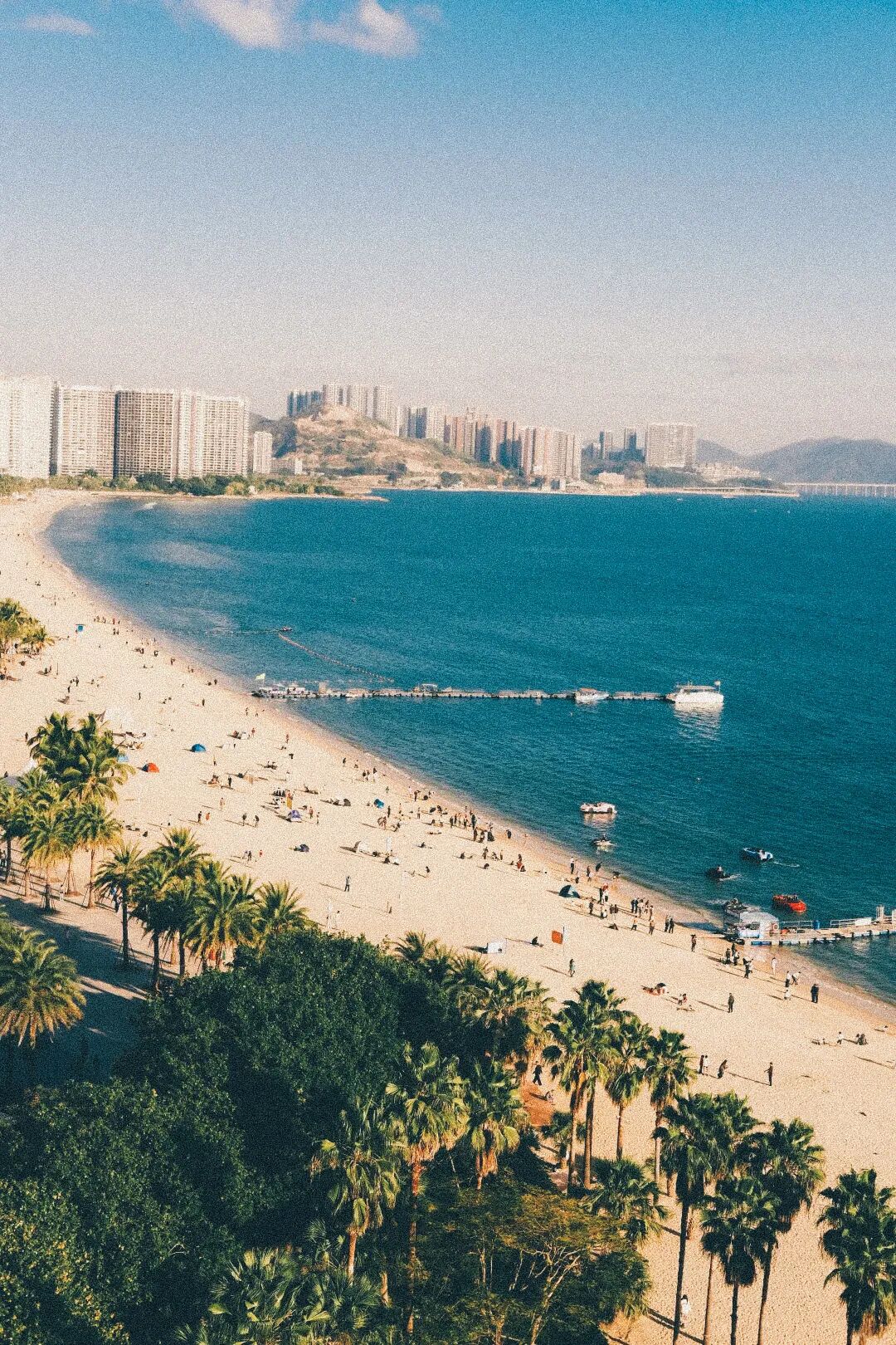 小径湾则显得克制许多。它的海岸线没有那么长,但环境干净,开发节奏也慢一些。海水颜色偏深蓝,冬天的空气透明度高,傍晚时光线柔软,整片海会慢慢变成带一点银灰色的蓝。沙滩上很少拥挤的人群,更多时候只有风声与浪声。有人在礁石边拍照,也有人只是坐着发呆。海浪声很清楚,远处偶尔能看到渔船慢慢移动。
