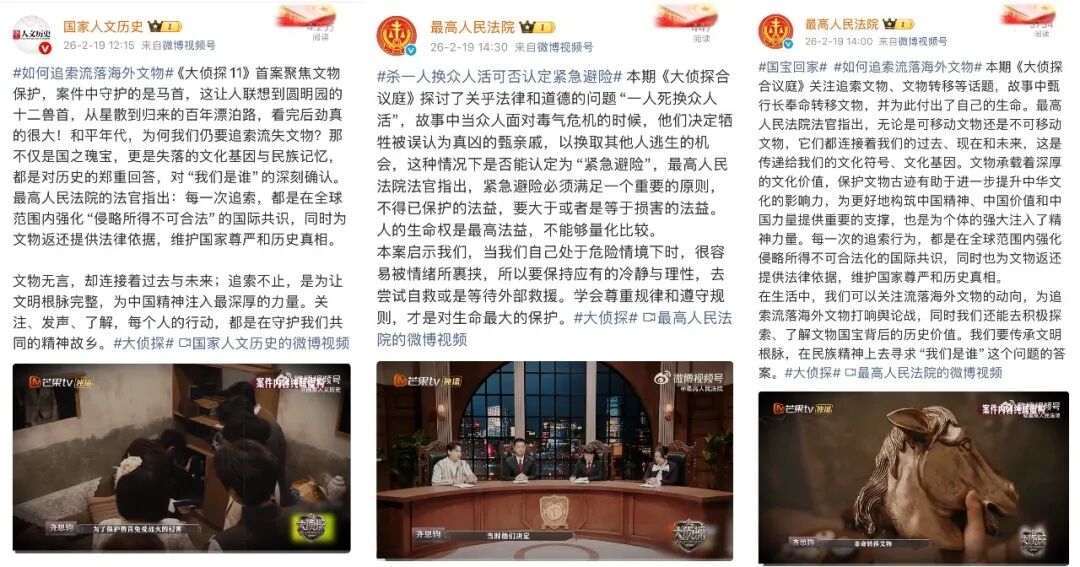 @国家人文历史 @最高人民法院 共同发布议题,关于文物保护@国家人文历史 发文表示:“和平年代,为何我们仍要追索流失文物?那不仅是国之瑰宝,更是失落的文化基因与民族记忆,都是对历史的郑重回答,对‘我们是谁’的深刻确认”,@最高人民法院 就“紧急避险”展开科普:“紧急避险必须满足一个重要的原则,不得已保护的法益,要大于或者是等于损害的法益。人的生命权是最高法益,不能够量化比较。”一系列讨论引发观众强烈的共鸣。