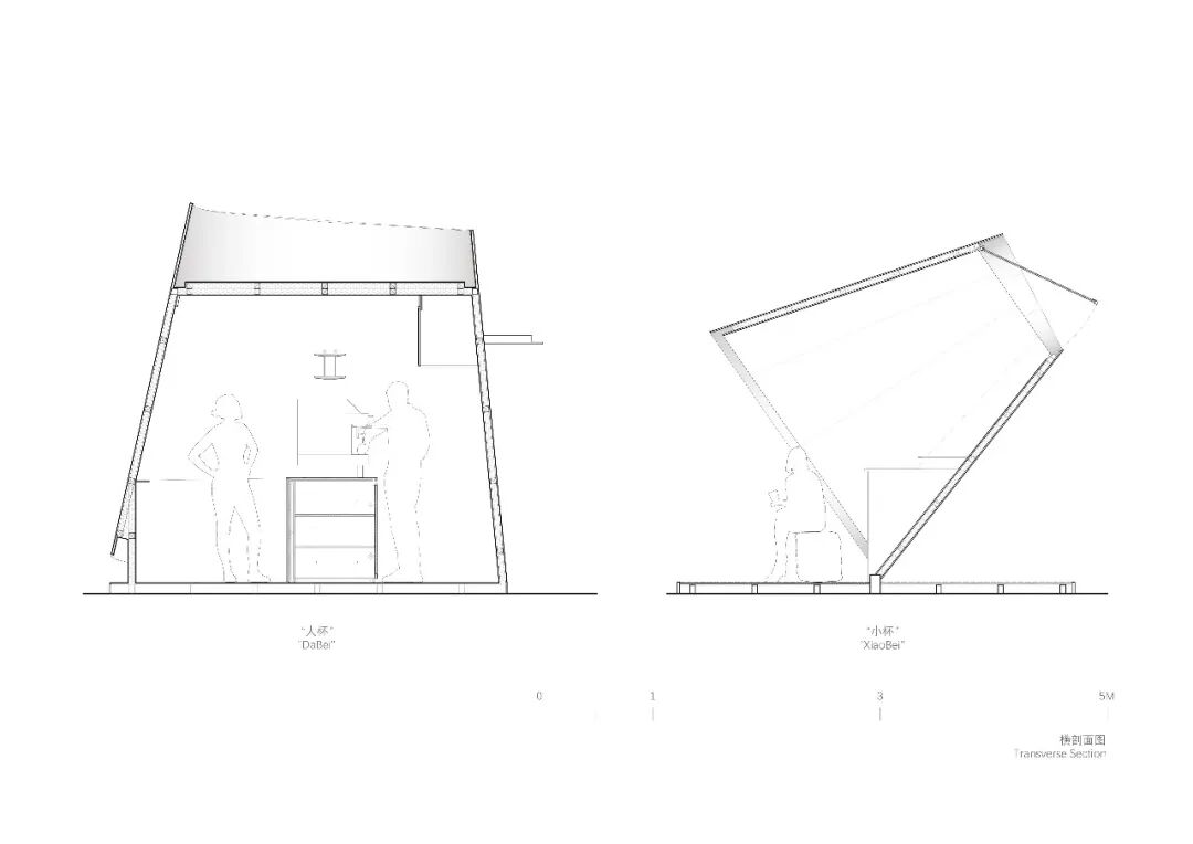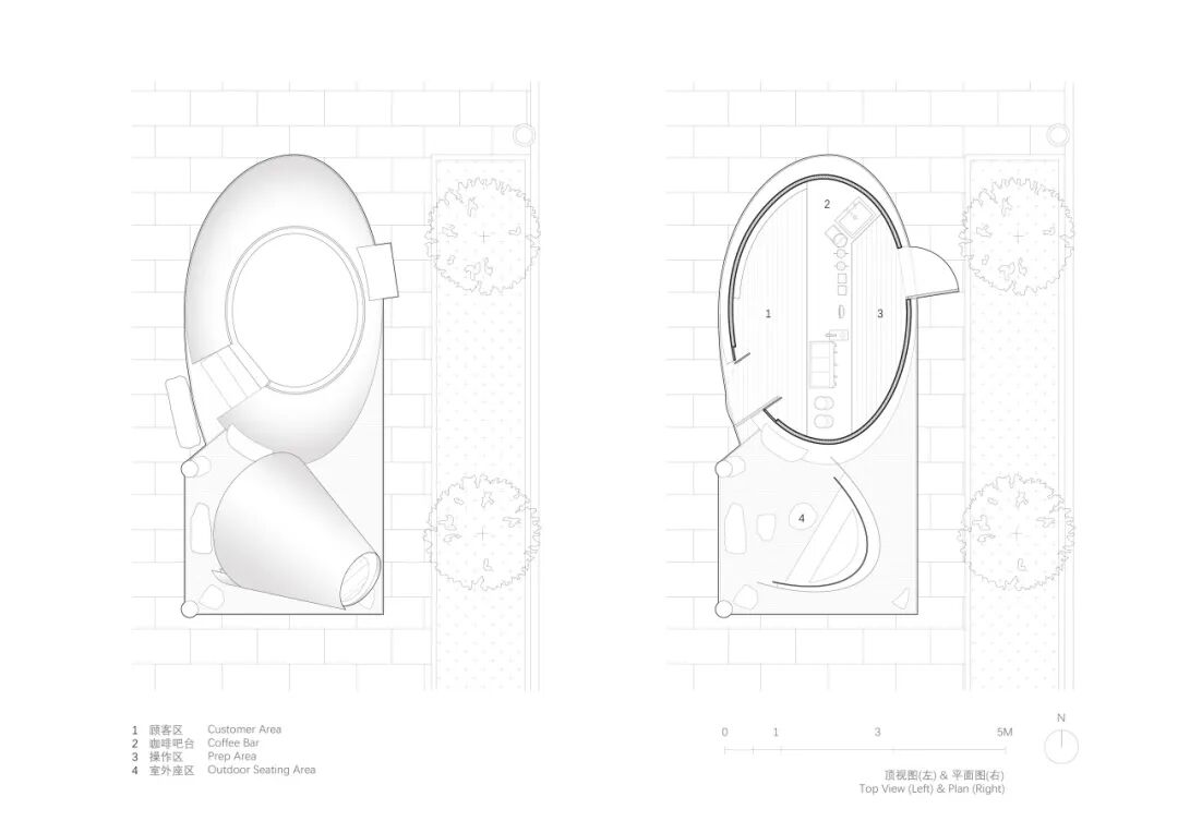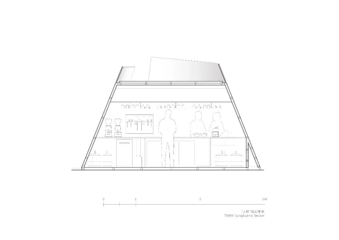 场地尺度的限制要求实现空间利用的最大化。大杯的平面布局紧凑高效,中间的线性吧台清晰划分操作区与顾客区。再以覆扣大杯为形,借围合界面,消解了街头喧嚣。