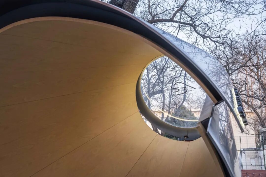 上沿可开启的玻璃屋面,既应对了极端天气下可能出现的风荷载过大的不利因素,同时兼顾季节更替带来的内部体验。人们品尝手中咖啡之余,不忘抬头望向城市的天空与枝叶的四季变化。