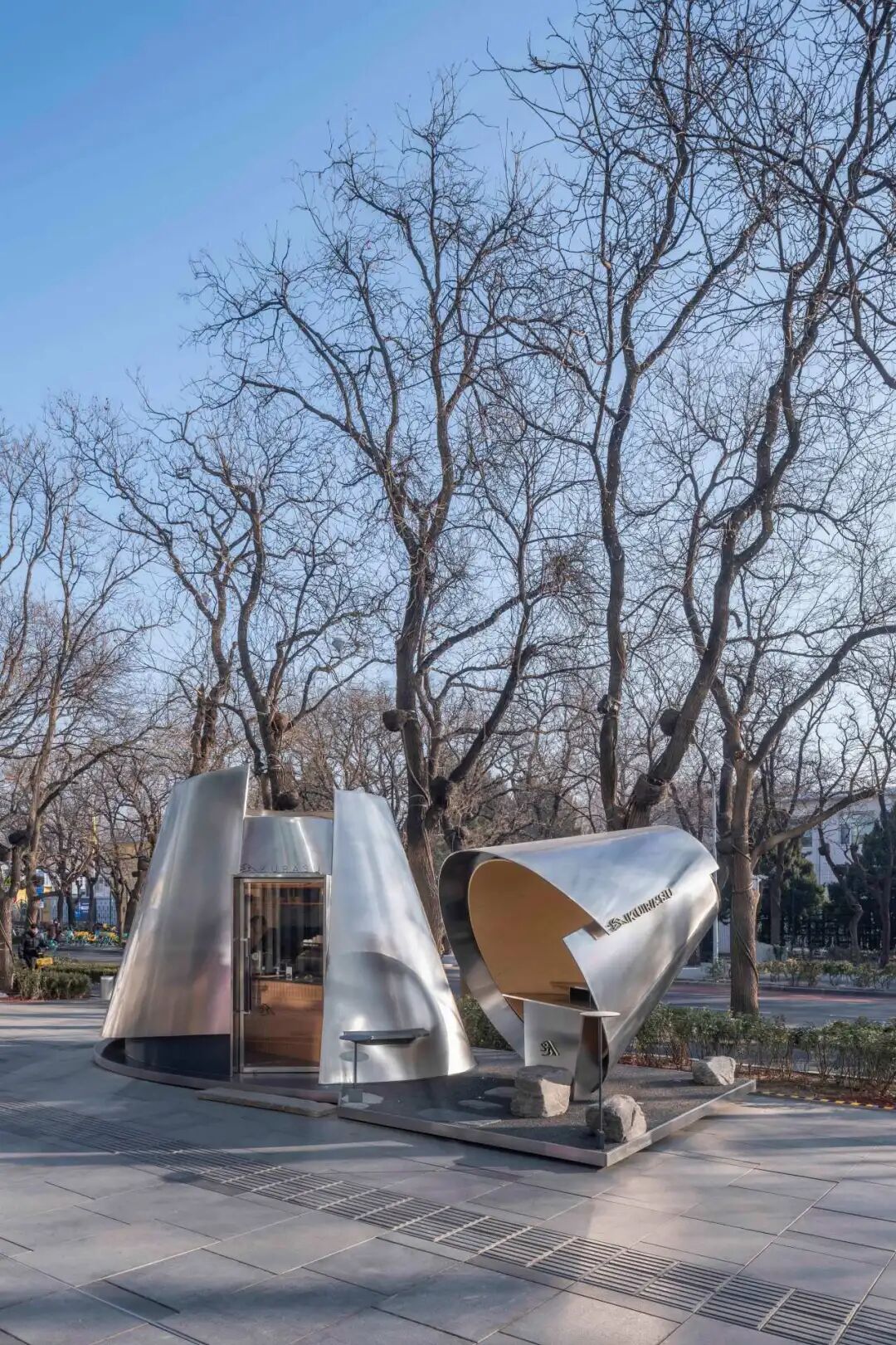 “大杯”以覆扣的姿态实现内向围合,构建出咖啡冲煮与体验的核心空间;“小杯”以斜挑的形态形成外向开敞的展示界面,成为品牌与城市互动的窗口。
