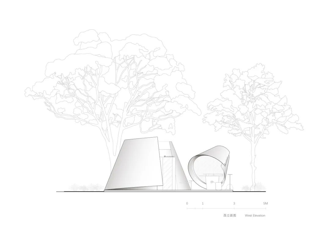 钢结构底座将两个杯体钢结构锚固于地面,悄然承担配重之责,同时又在角落处微微翘起,以回应纸折艺术的轻盈。深色的小砾石结合天然石板与石块,既满足通行与闲坐,也整体围合出庭院景观。