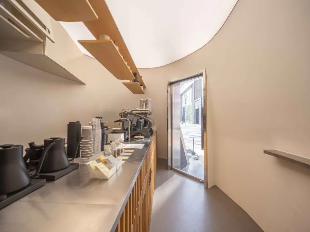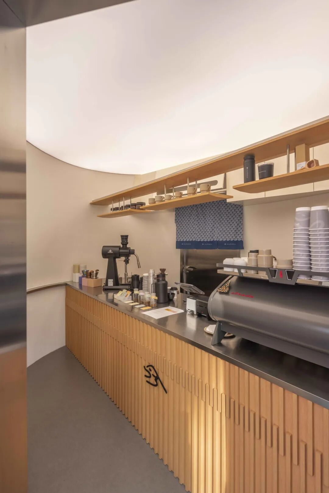 更见细节与巧思的是,墙面在操作区一侧微妙地倾斜较缓,以最大化咖啡师的活动空间;而在顾客区,弧墙倾斜角度加大,强化空间的身体感知。让方寸之间拥有如居酒屋般的沉浸式体验。