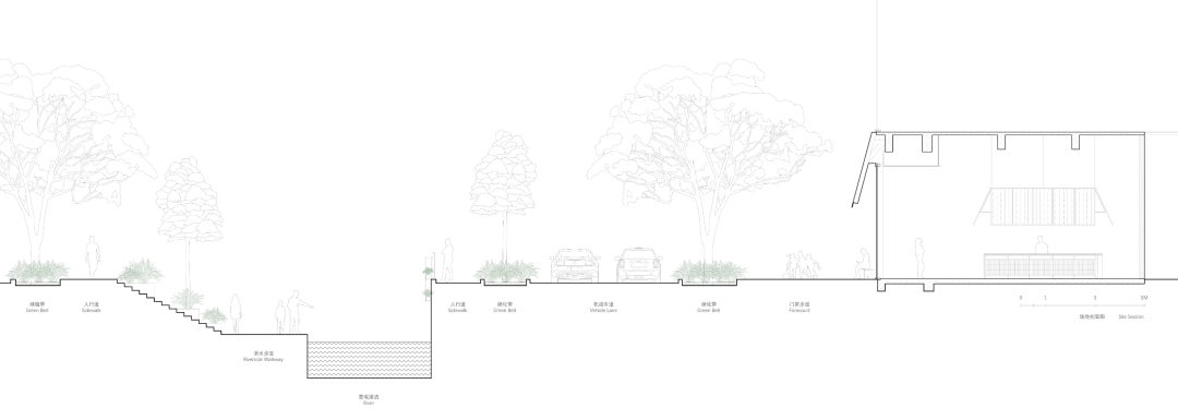 外檐压低的高度与角度,与场地旁的乌桕树、紫花风铃木一同协调身体感知与外延的空间尺度,打造出室内外渗透的感官体验。可短暂驻足的室外座区,与周边的“溪水”、行道树、等界面相互交织,意在构建起人们在屋檐下闲坐品咖、静赏街巷林樾的社区氛围。