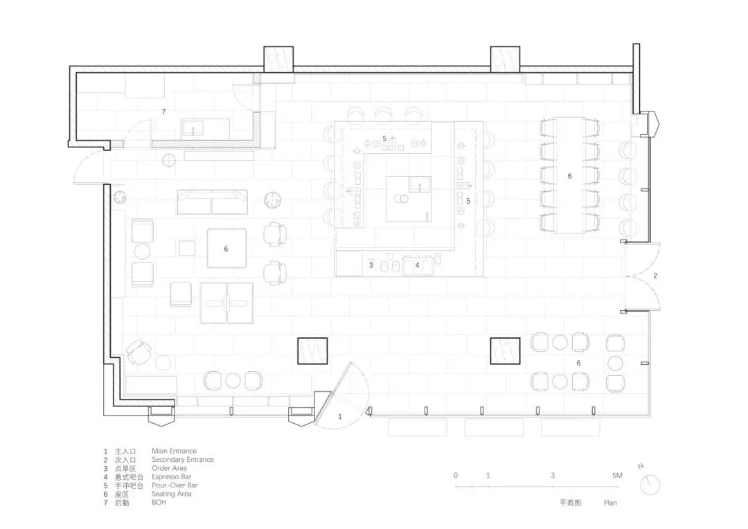 5.8米的板底高度,为设计提供了充足的表达维度。首层的主入口、意式吧台、手冲吧台构成动态体验区,构建出点单、冲煮、取餐的客流动线。在与业主充分沟通后,设计团队打破惯常咖啡空间的一字型吧台布局,以回字形吧台作为体验中心,手冲仪式、器具与香气在吧台弥散,形成交互性的视觉体验。