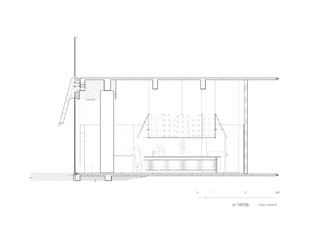 “外檐”为哑光金属波纹板斜屋顶,接续商圈幕墙外立面语言的同时,兼具遮阳功能。它对外作为环境光影的幕布,对内则压低视觉感知,加强对“慢空间”氛围的渲染。“内檐”为微微打开的轻透界面,暗示咖啡吧台如随时可进行手冲表演的舞台。二者共同形成屋中屋的空间层级。